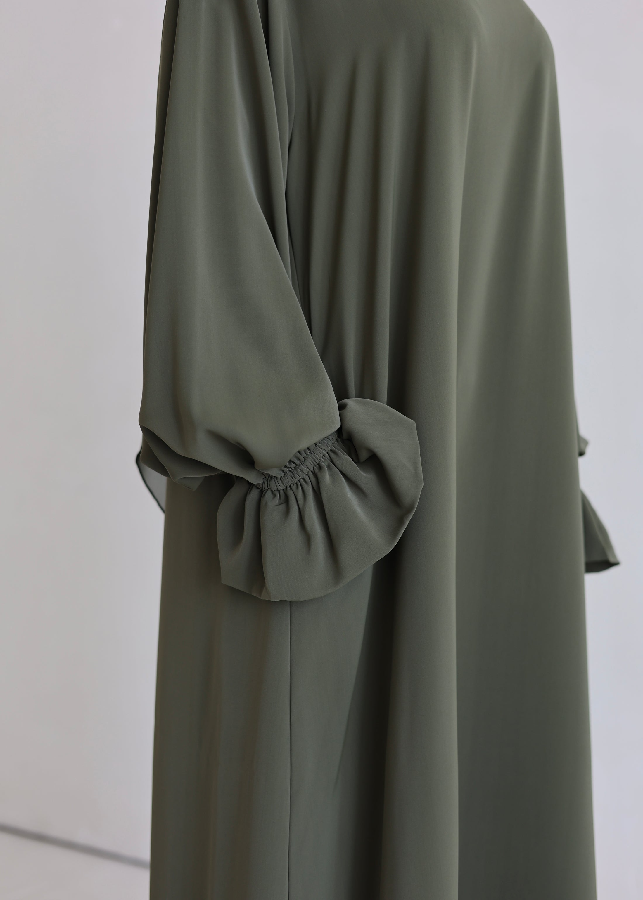 our abaya with khimar set offers all-day breathability and an airy, lightweight feel that’s easy to style. Its fuss-free matching khimar and abaya with ruffle sleeves makes it the perfect alternative to the hijab and jilbab.