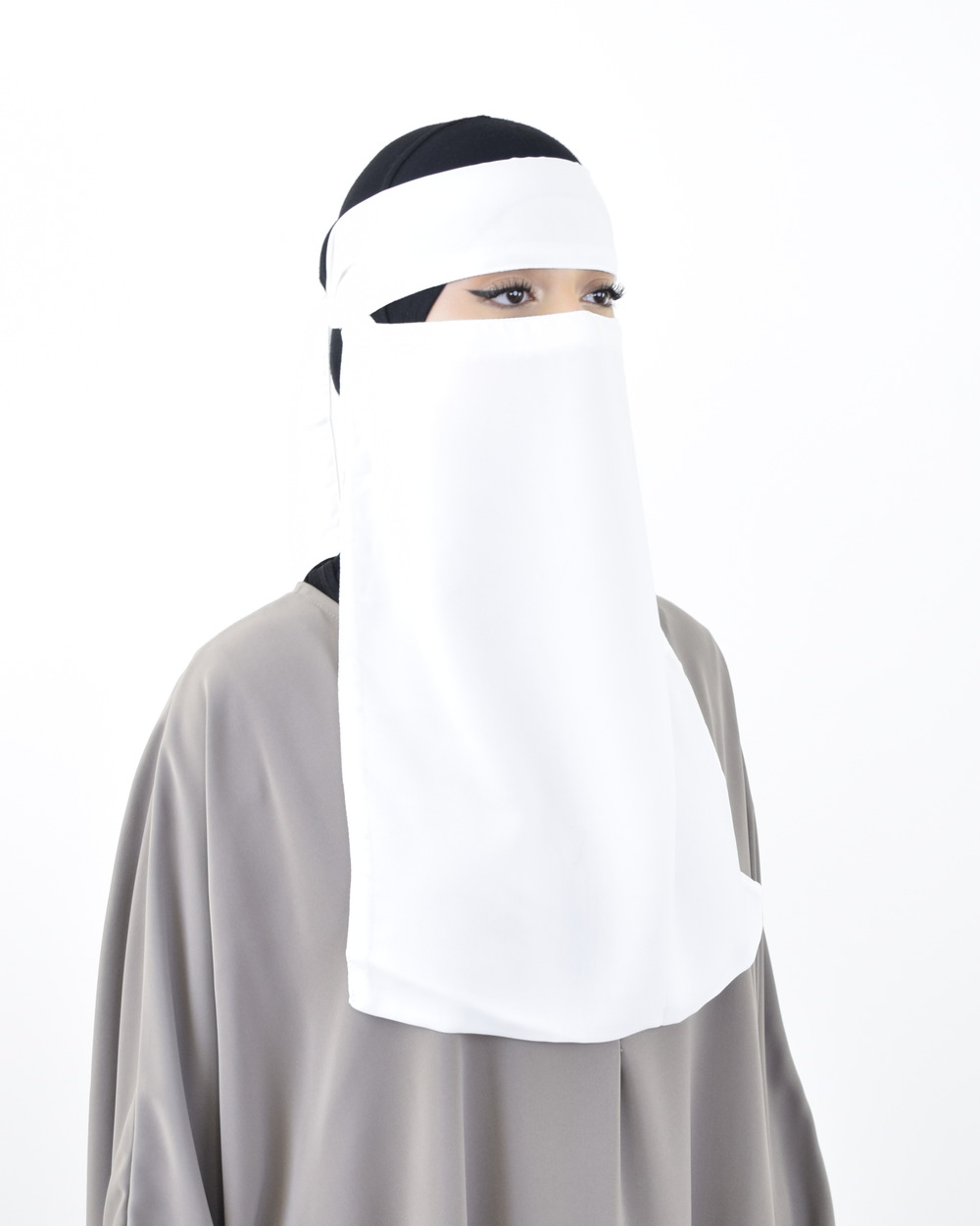 A soft, lightweight niqab designed with a no-pinch eye opening for maximum comfort. Features long adjustable straps and breathable fabric for everyday wear. Length: 42 cm. Color: White.