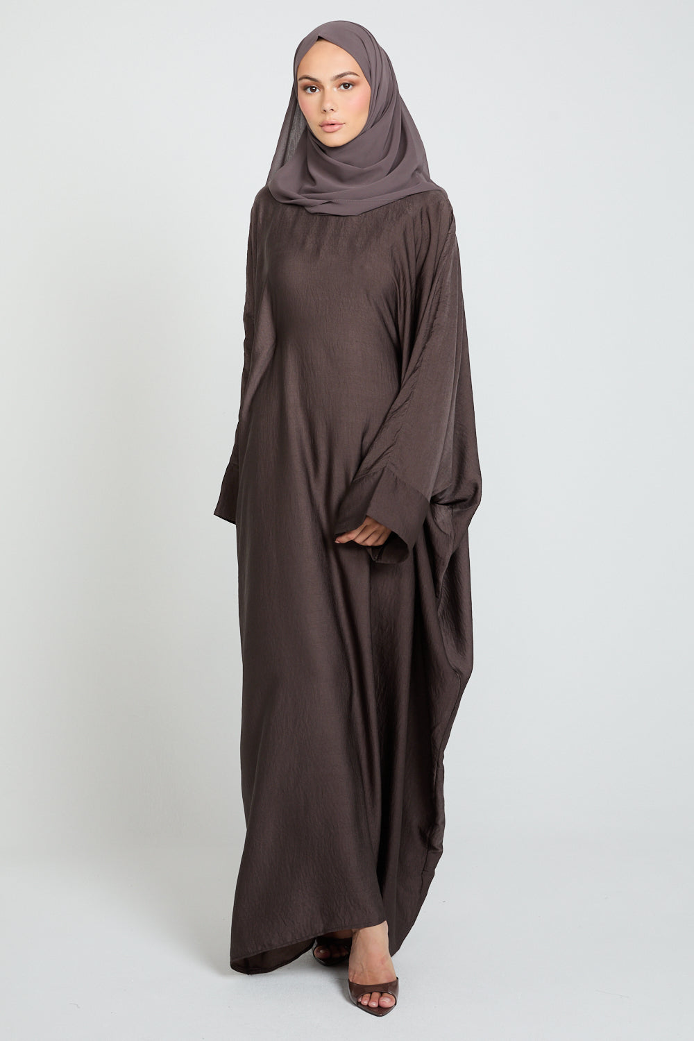 ₹4,999.00Original price was: ₹4,999.00.₹3,499.00Current price is: ₹3,499.00.Classic Lustre Abaya in smoky coffee, crafted from soft, lustrous polyester. Features an adjustable inner belt, closed modest design, and includes a matching hijab.