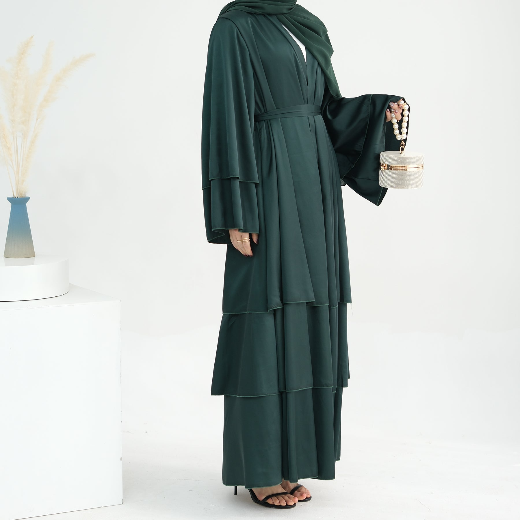 Liyana Layered Satin Open Abaya – Dark EmeraldRated 5.00 out of 5