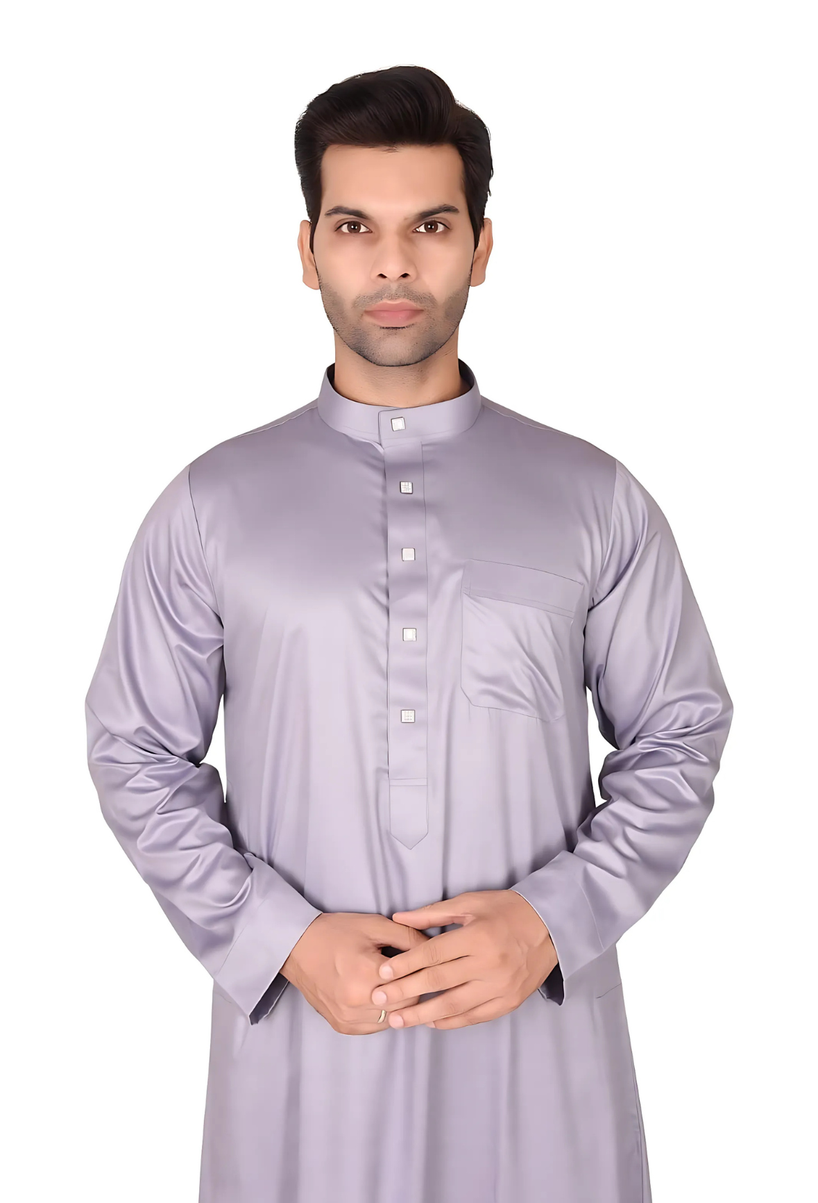 The Emirati Thobe in white is a classic, ankle-length garment made from lightweight fabric.