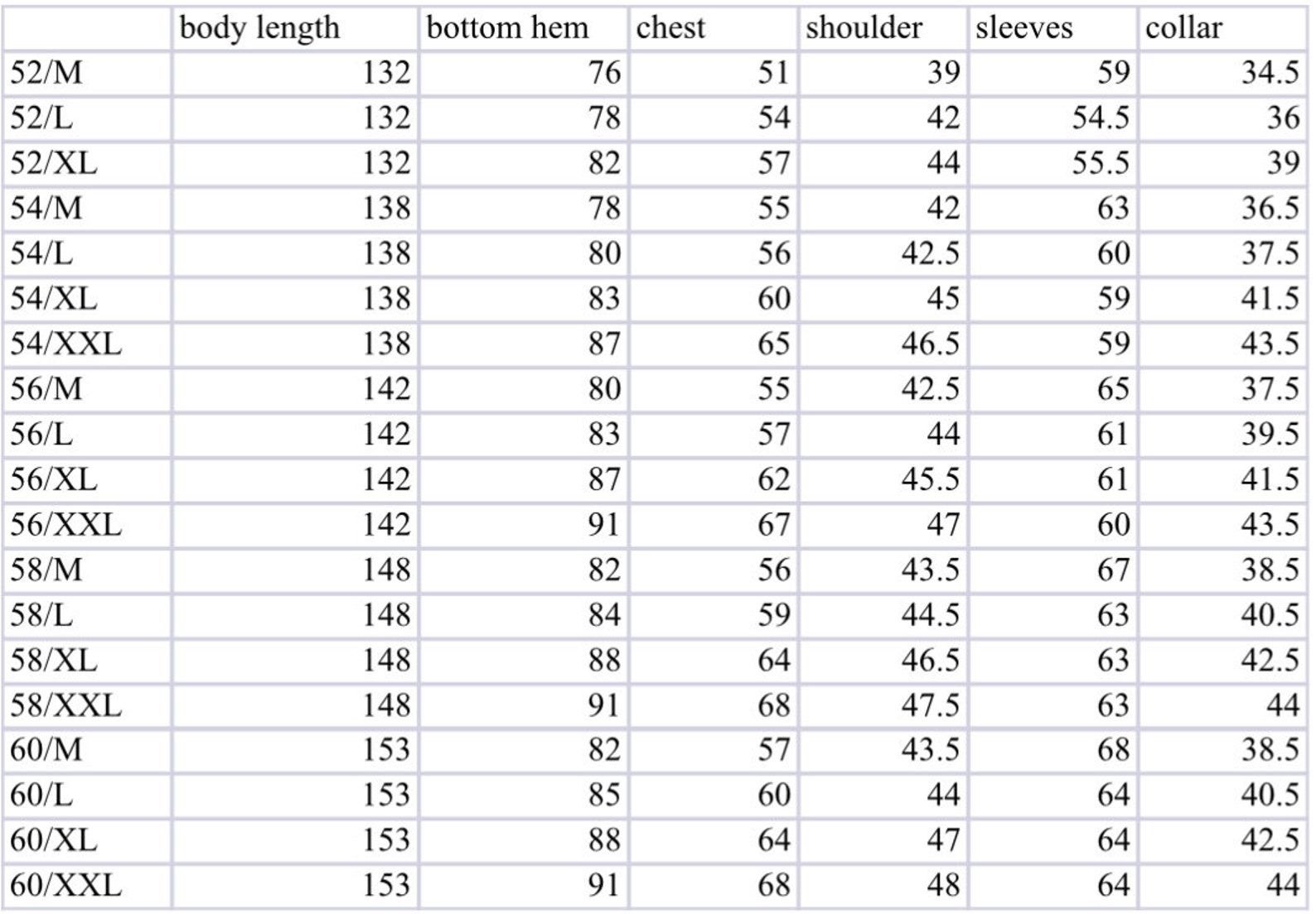 Size Bust (inches) Waist (inches) Hip (inches) Length (inches) XS 34–35 28–29 36–37 52 S 36–37 30–31 38–39 53 M 38–39 32–33 40–41 54 L 40–41 34–35 42–43 55 XL 42–44 36–38 44–46 56 XXL 45–47 39–41 47–49 57