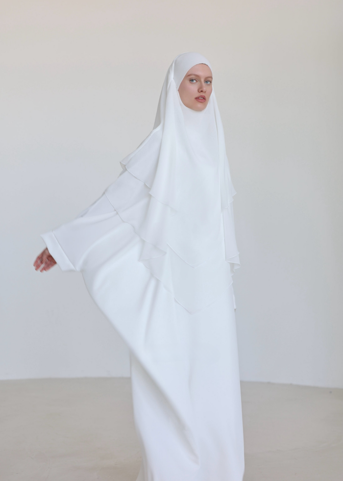 Crafted in a noble white shade, this abaya symbolizes timeless purity and serene sophistication. The airy fabric drapes beautifully over the body, offering both comfort and refinement. As the material is not fully opaque, we recommend pairing it with a skin-colored slip for a smooth and elegant finish.