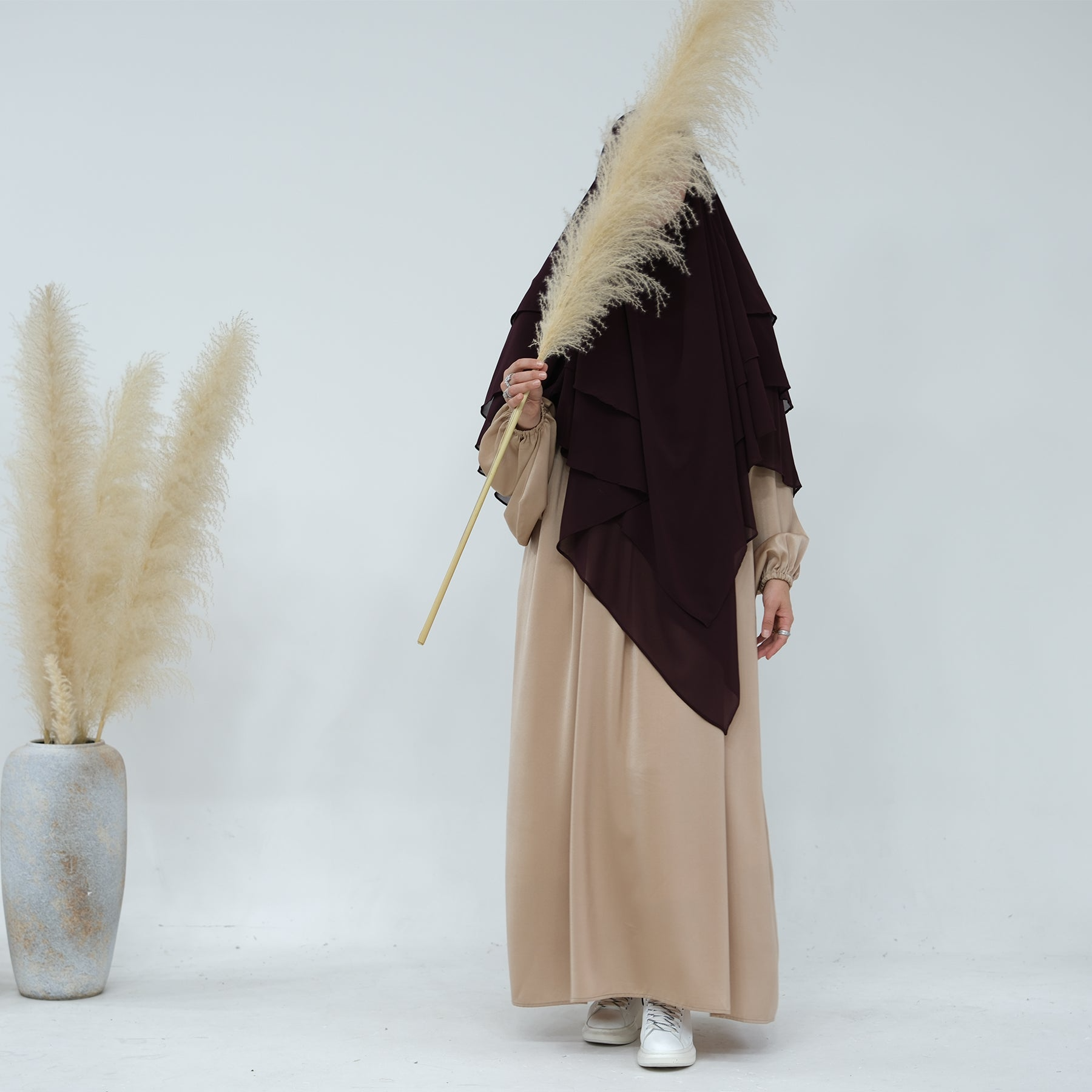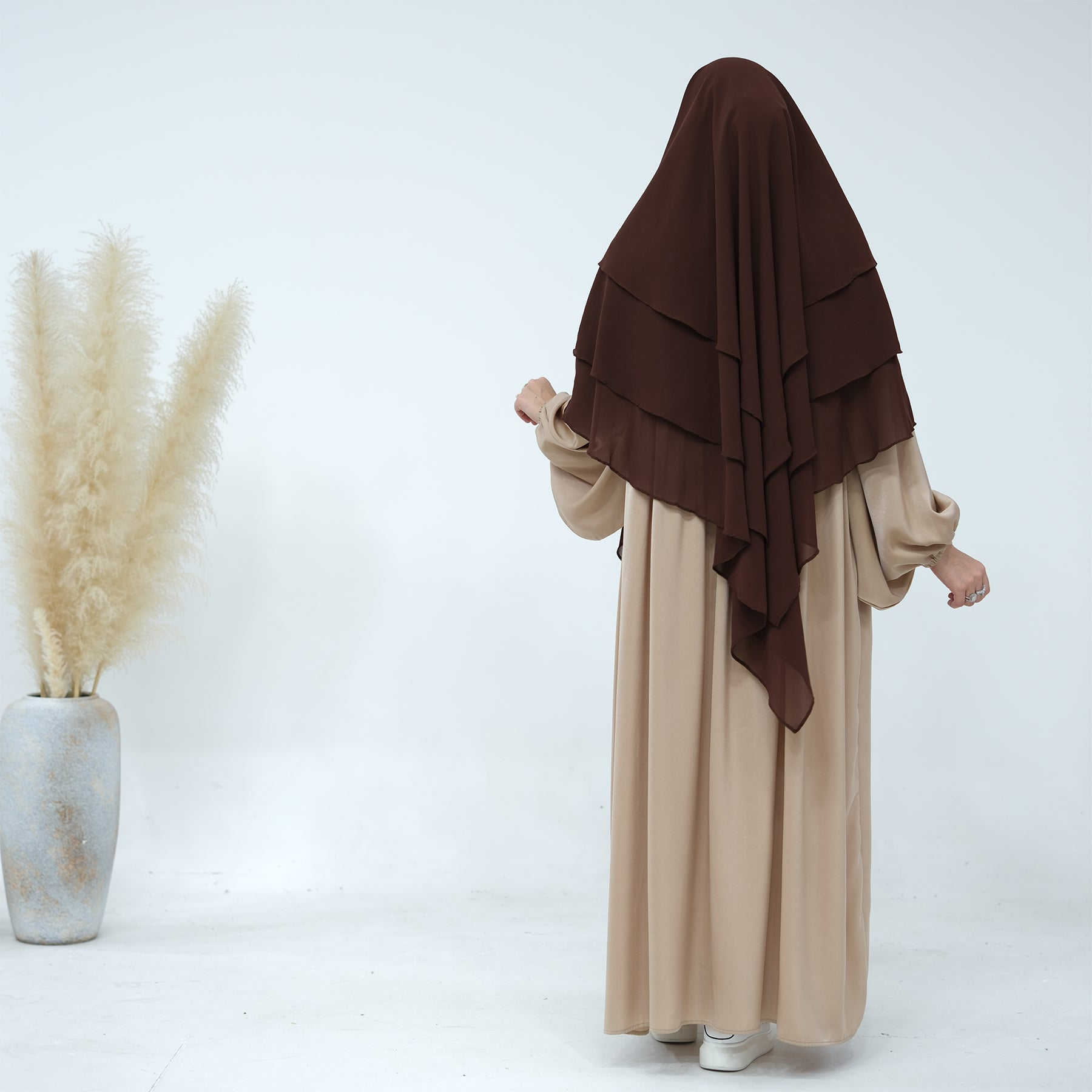 Shop our Three-Layer Chiffon Khimar — premium chiffon layers for elegant volume, soft comfort, and a romantic, face-framing design.