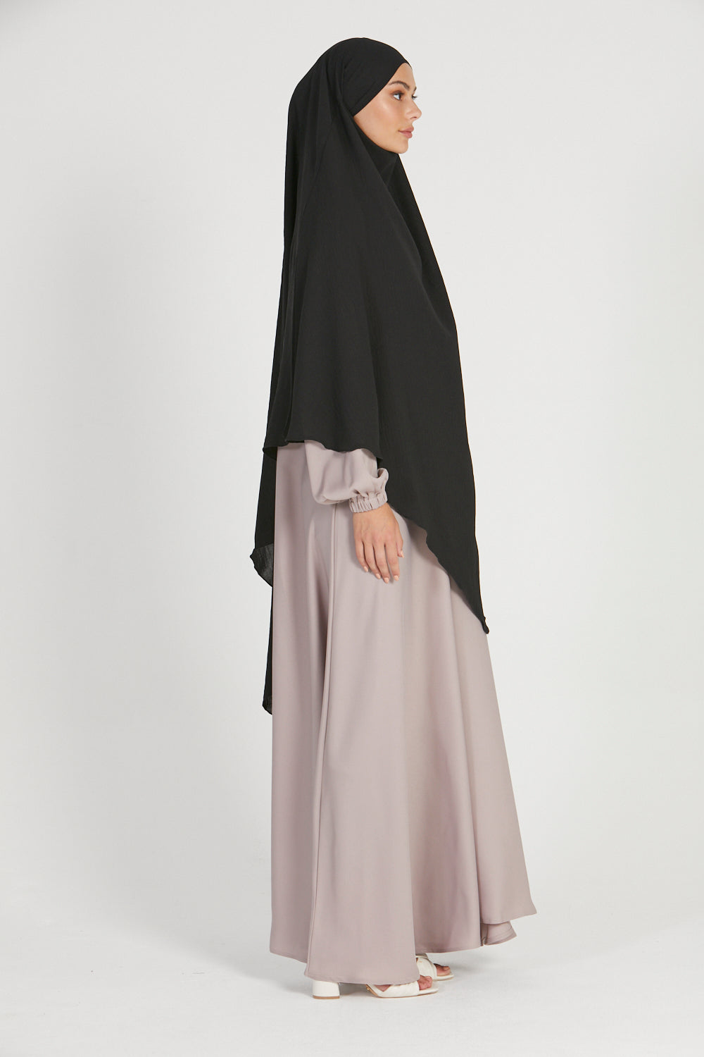 Crafted from luxurious soft crush fabric, the Charcoal One Layer Khimar offers all-day breathability and an airy, lightweight feel that’s easy to style over any of your abayas.
