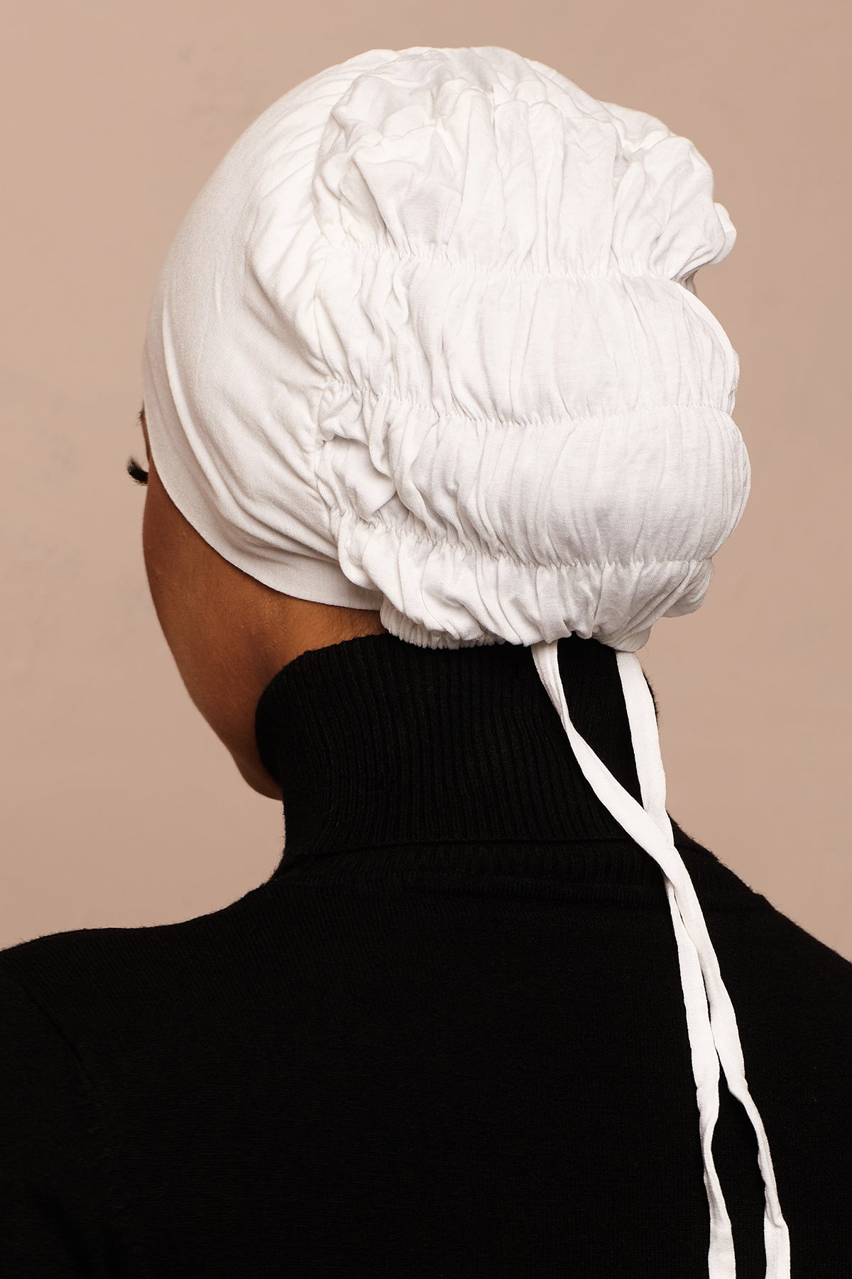 A pure white bamboo jersey hijab cap featuring an integrated scrunchie for added volume, a secure non-slip fit, and breathable all-day comfort.