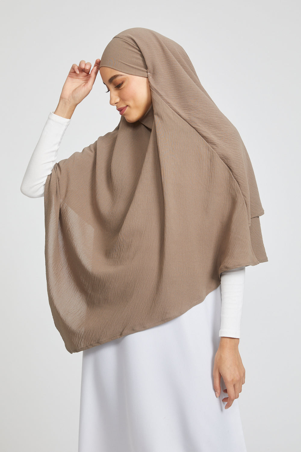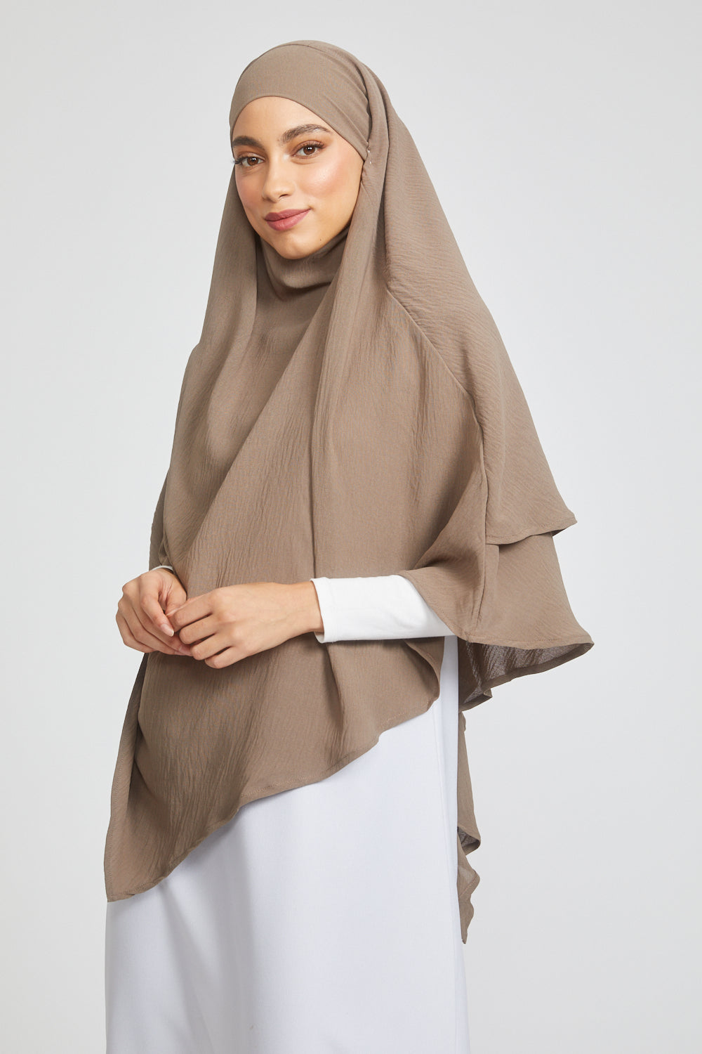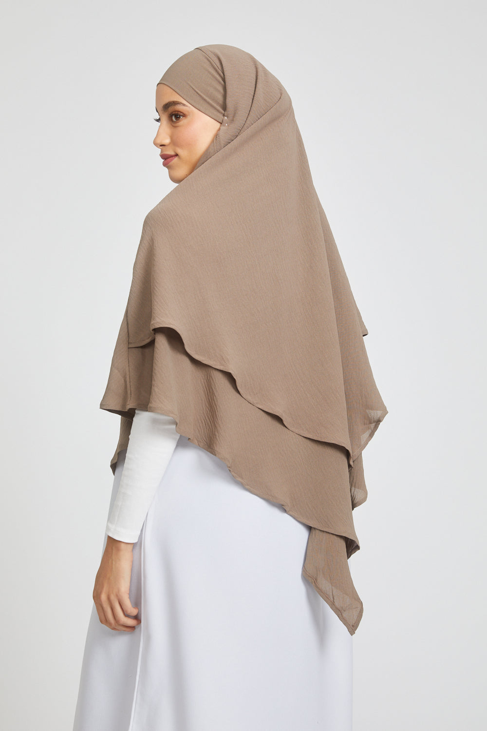 Crafted from luxurious soft crush fabric, the Cocoa Glaze Two Layer Khimar offers a perfect blend of breathability, coverage, and effortless grace. Its airy, lightweight feel drapes beautifully over any abaya, making it your go-to choice for both everyday wear and special moments.