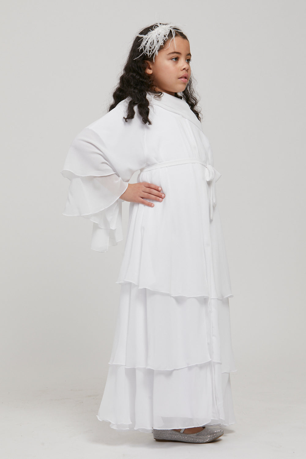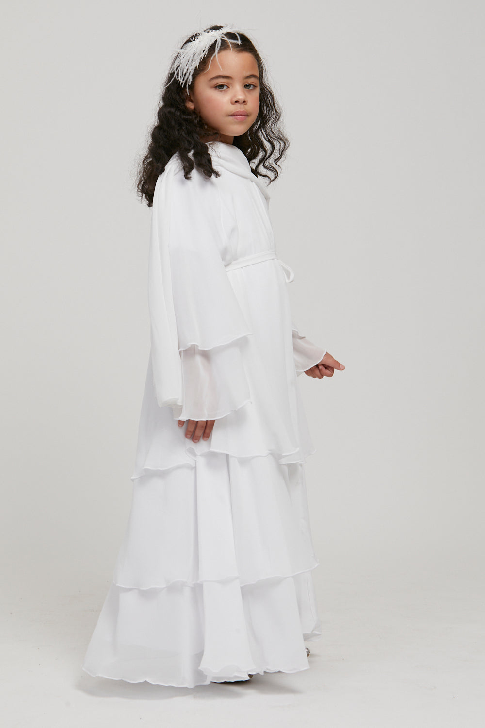 This elegant Girls’ Chiffon Layered Open Abaya is made from light chiffon with a flowing silhouette. It includes a matching hijab and belt, and can be worn open or closed. Perfect for special occasions and Umrah/Hajj.