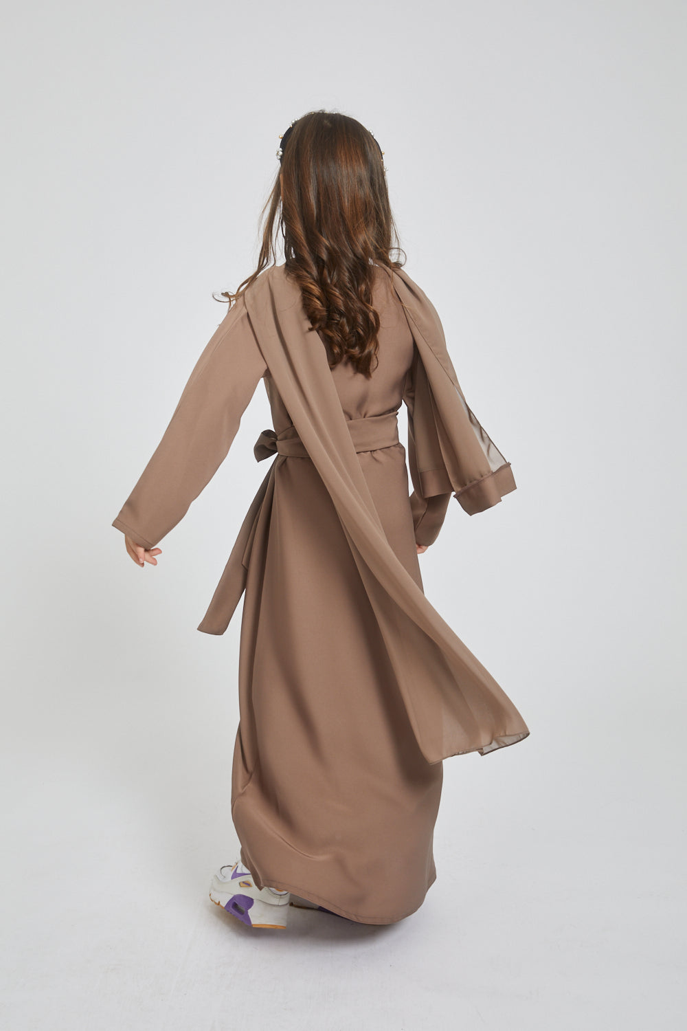 The Girls’ Butterfly Abaya is a black closed abaya made from soft Nidha fabric. Its unique feature is the attached chiffon butterfly overlay, which adds graceful movement. Includes a matching hijab.