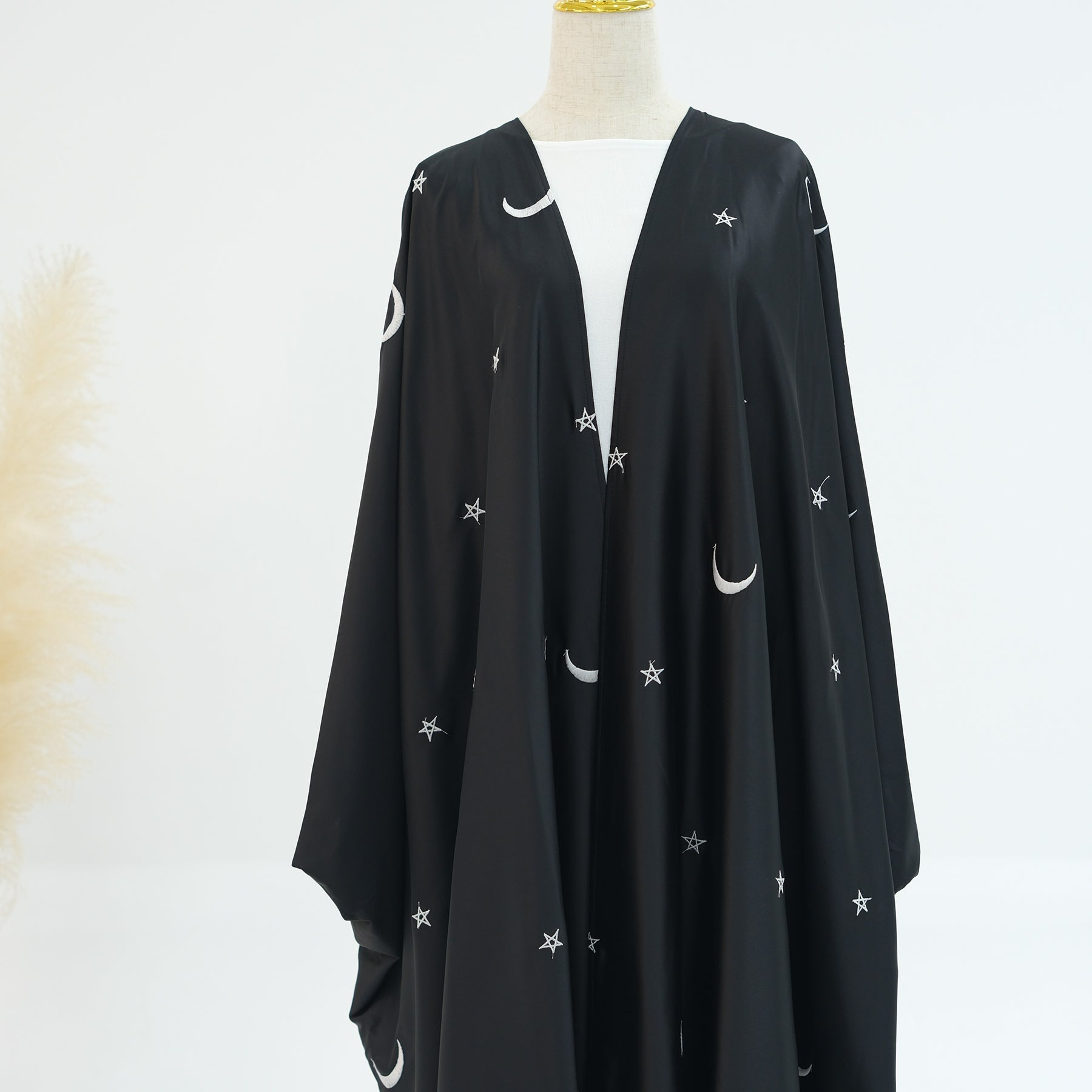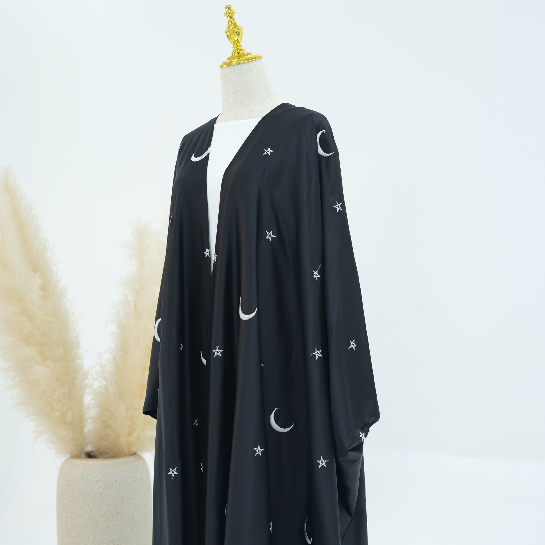 Inspired by the night sky, the Hannah Moon Star Open Abaya – Black brings a touch of cosmic elegance to your modest wardrobe. This beautifully crafted open kimono-style abaya features delicate moon and star detailing that adds a subtle sparkle to your look—perfect for both everyday grace and special occasions.