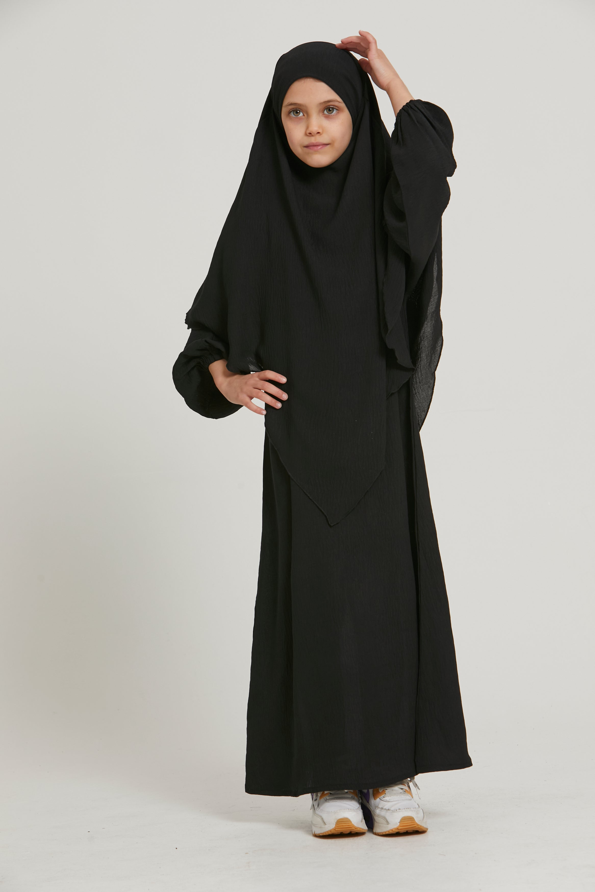 Crafted from luxurious soft crush fabric, our Girls Abaya with khimar set offers all-day breathability and an airy, lightweight feel that’s easy to style. Its fuss-free matching khimar and abaya with elastic sleeves makes it the perfect alternative to the hijab and jilbab. This abaya set with khimar is perfect for Arabic school/mosque, Umrah or just daily wear. The khimar comes with tie back strings to tie around your head.