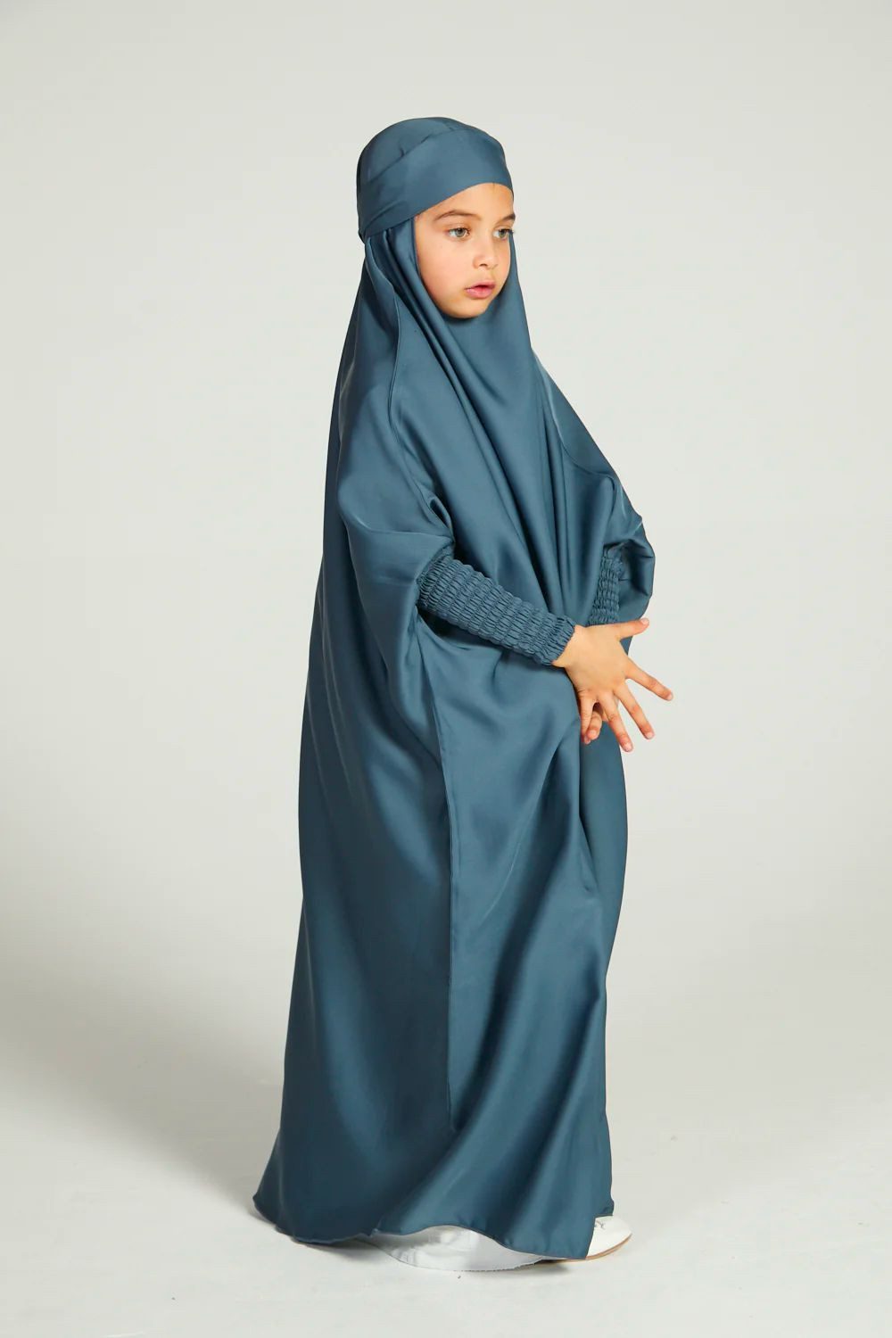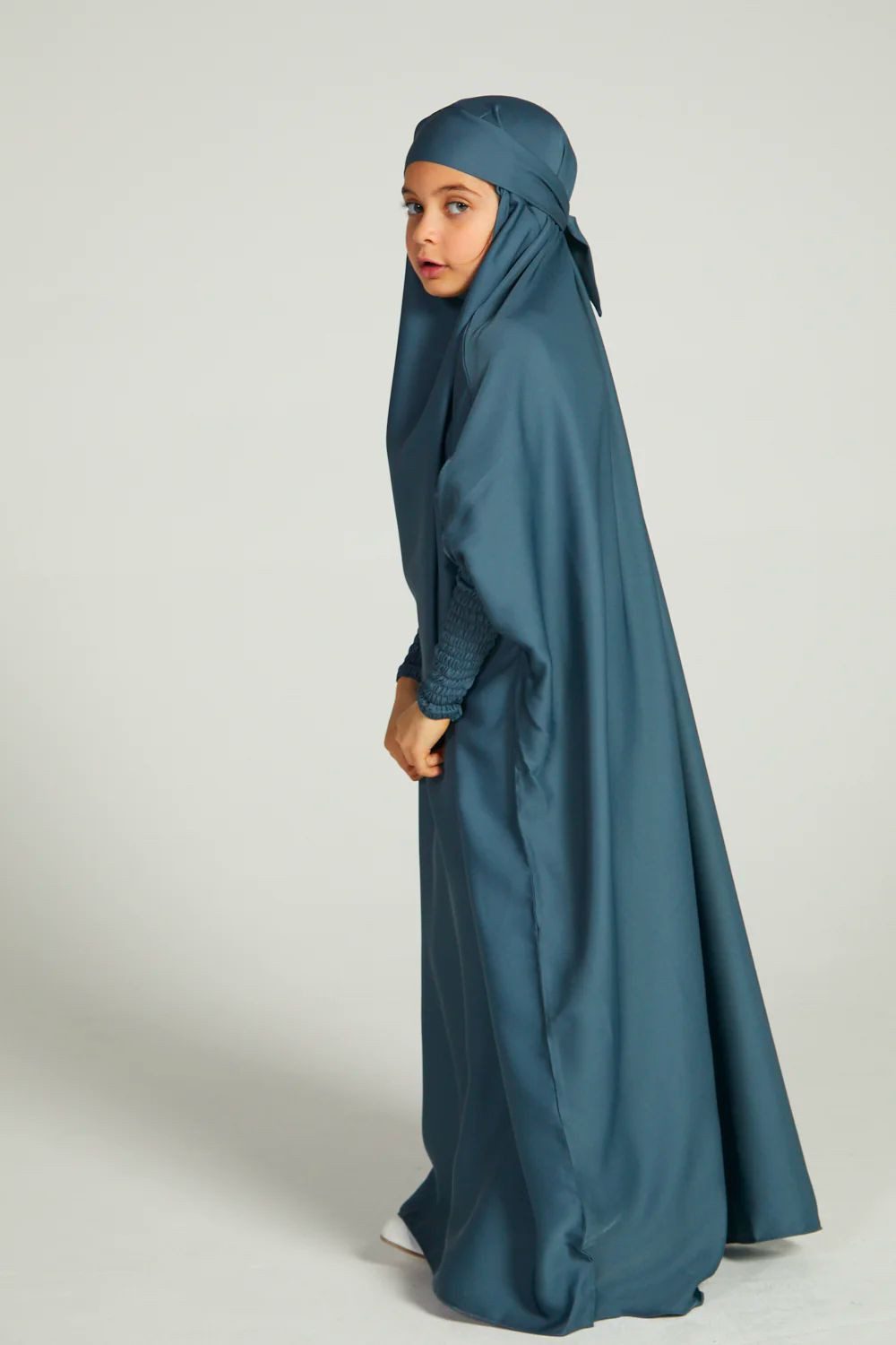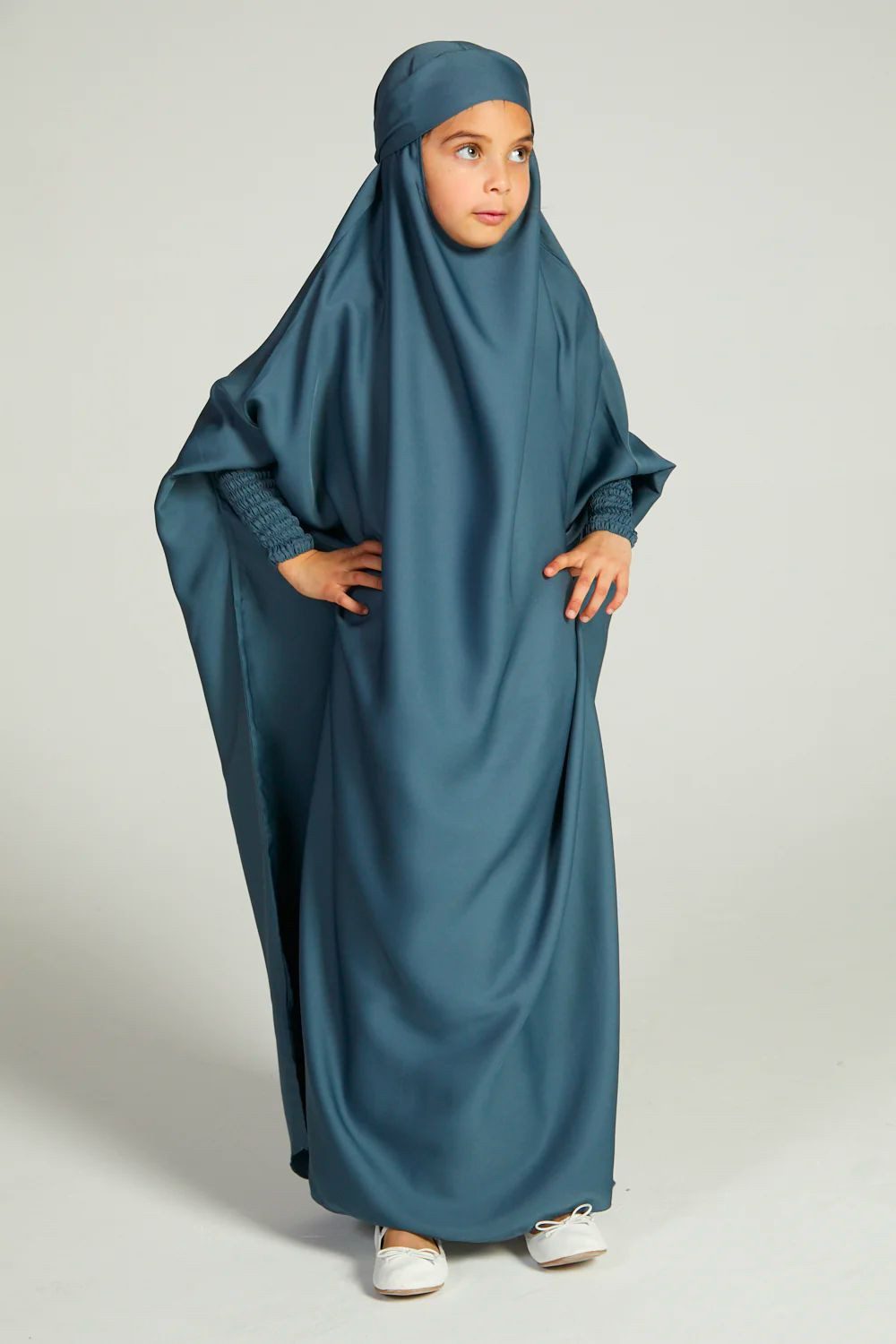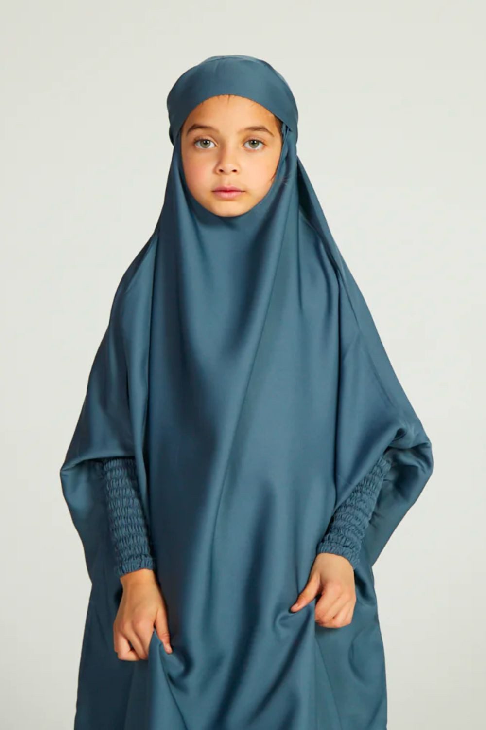 Comfortable, simple and classy, our girls’ French blue one-piece, full-length jilbab is perfectly lightweight which can be worn as daily wear or used for prayers. Complete your daughter’s modest wardrobe with a dark blue jilbab designed for girls.