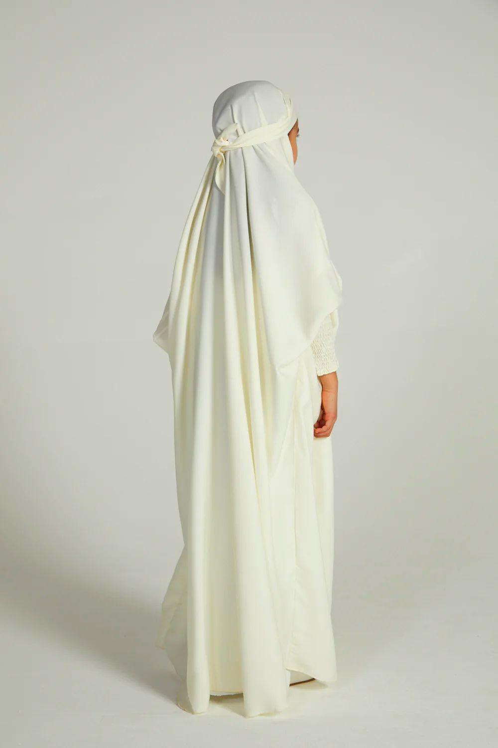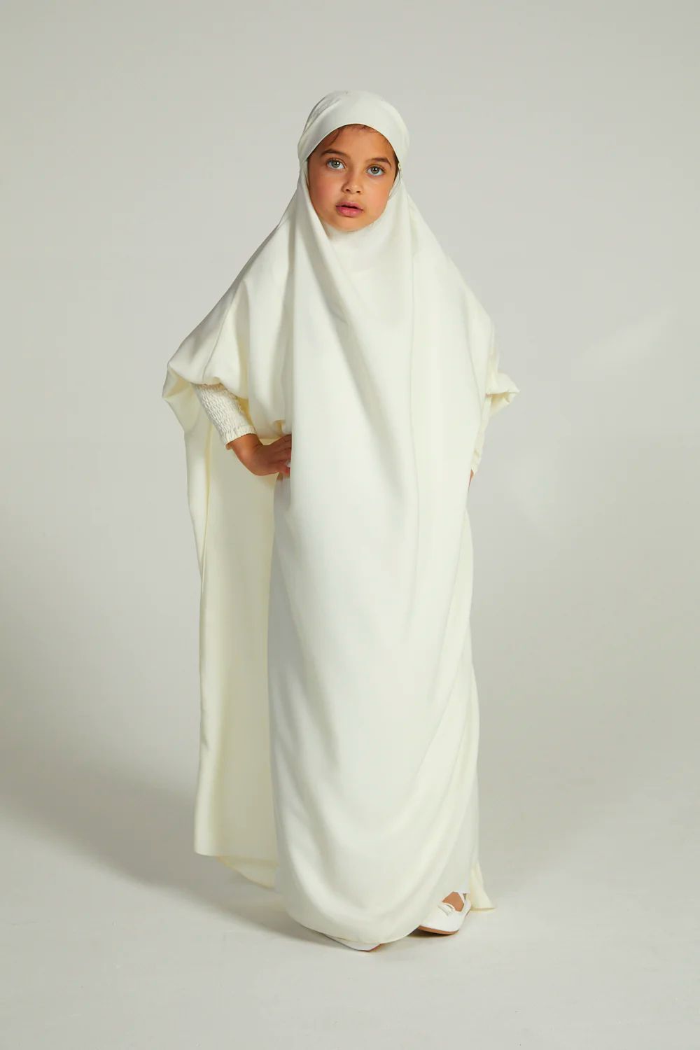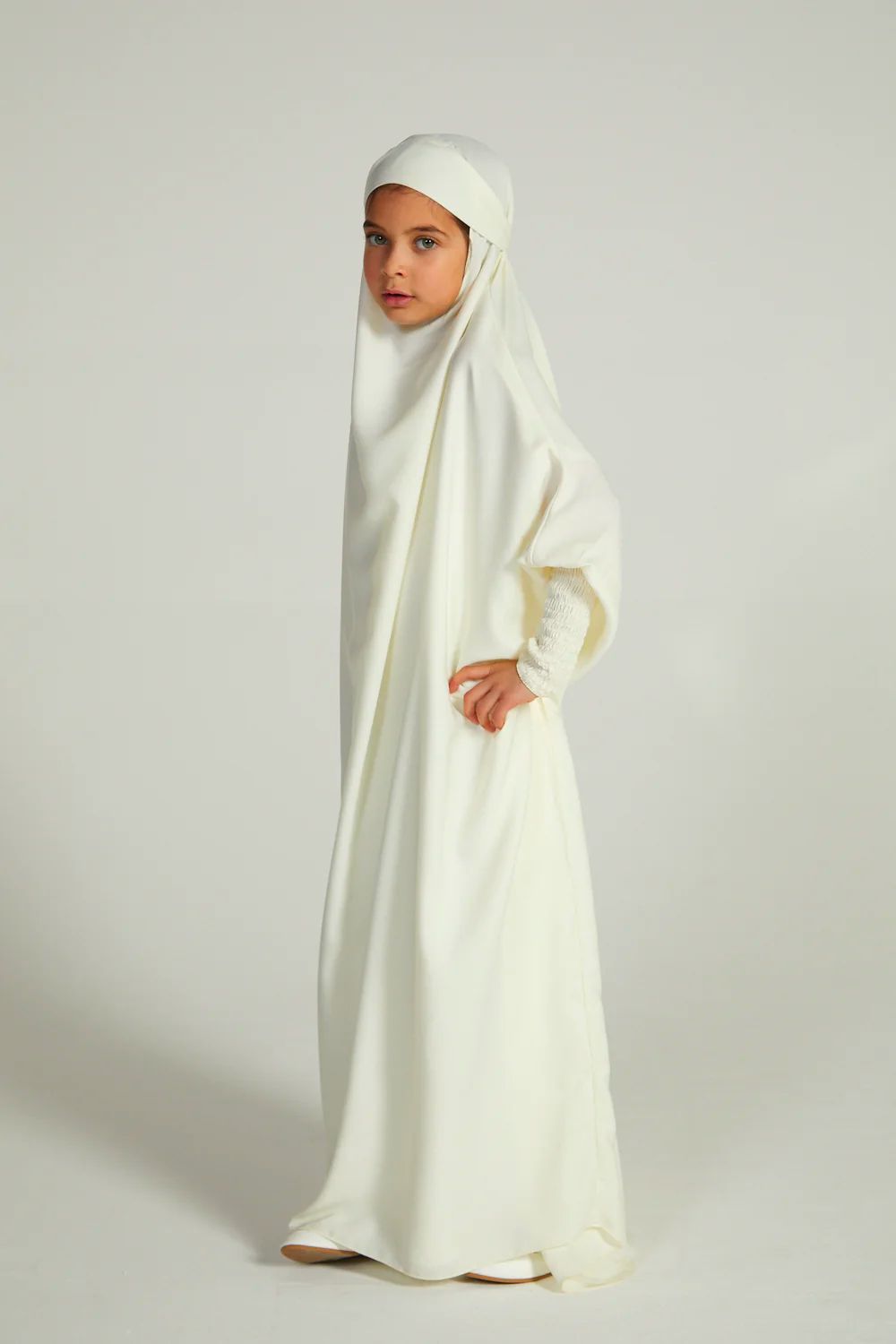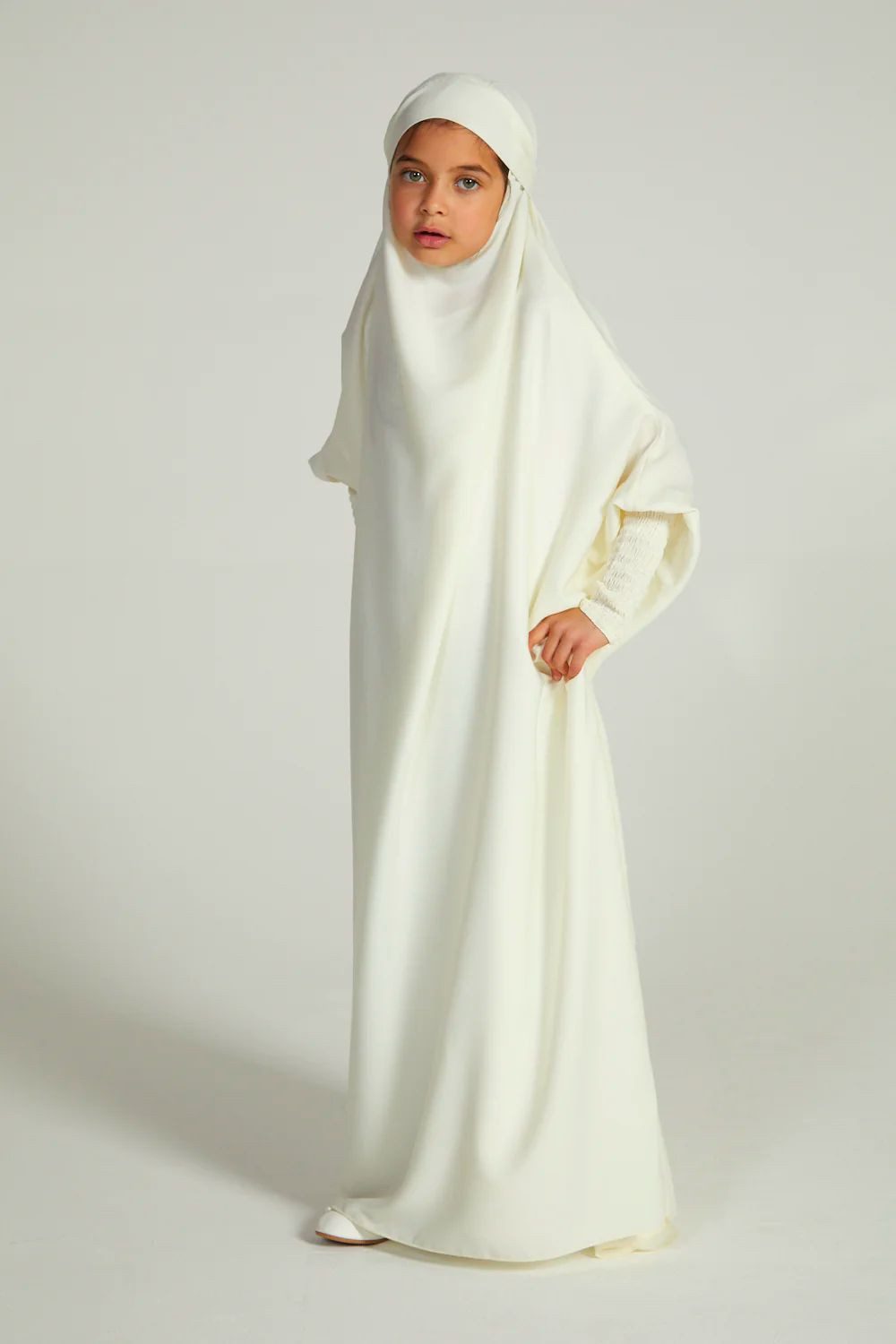 Comfortable, simple and classy, our girls’ ivory white one-piece, full-length jilbab is perfectly lightweight which can be worn as daily wear or used for prayers. Complete your daughter’s modest wardrobe with an ivory white jilbab designed for girls.