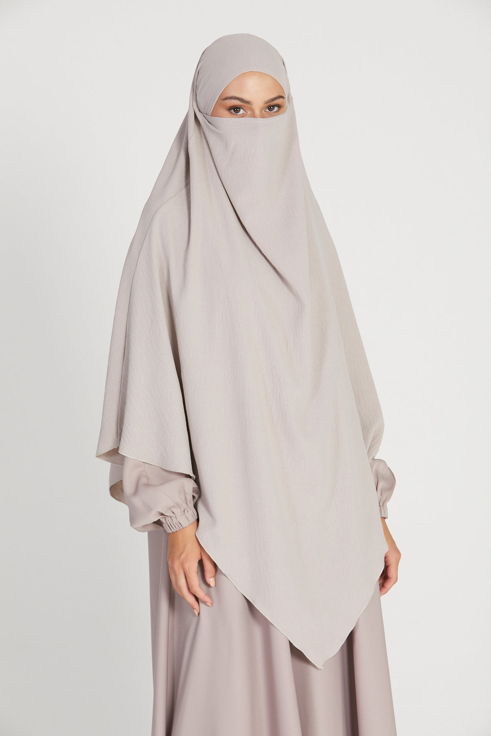 Includes: One-layer khimar with tie-back strings and built-in niqab panel