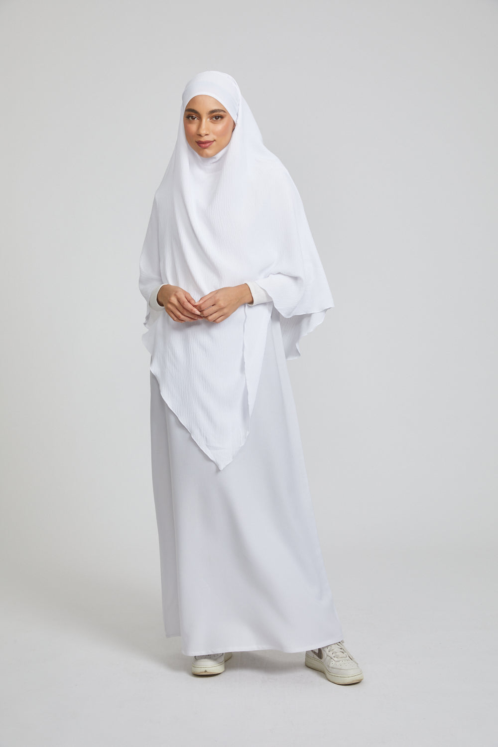 Embrace purity and grace with our White Two Layer Khimar, crafted from luxuriously soft crush fabric. Designed for lightweight comfort and full coverage, this khimar drapes effortlessly over your abayas, making it the perfect choice for prayer, daily wear, or special occasions.