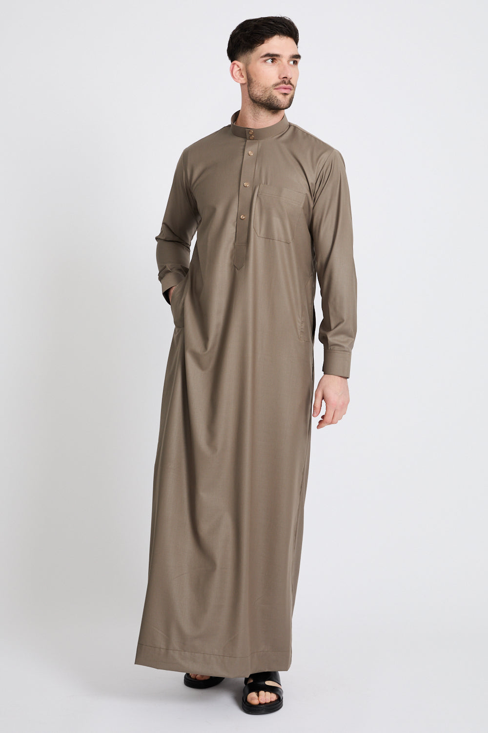 The Premium Classic Buttoned Thobe – Khaki Olive is where sophisticated design meets superior comfort.