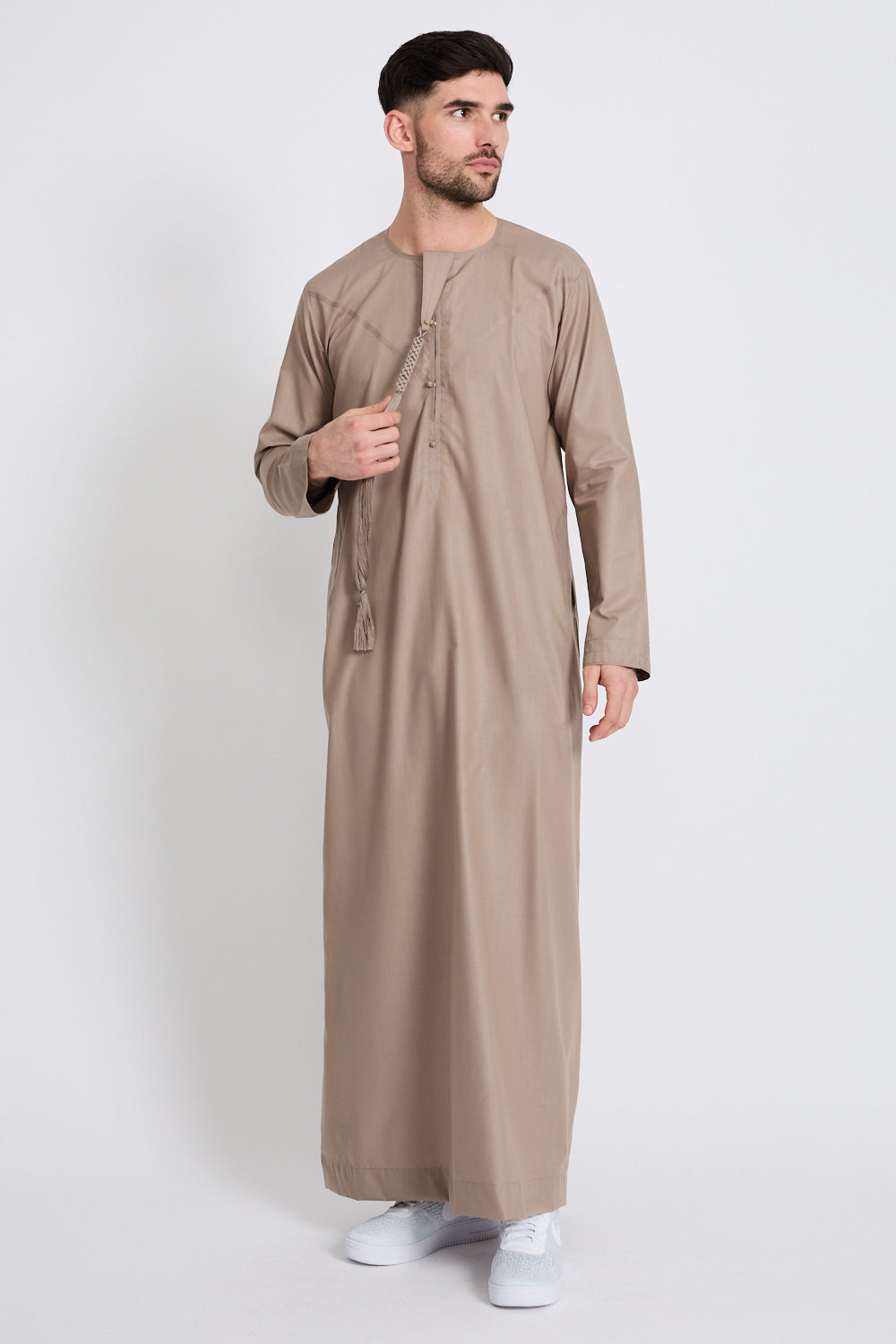 The Premium Emirati Thobe – Latte is the epitome of understated sophistication. Made from 100% spun polyester, this thobe offers a soft, smooth finish that feels comfortable and luxurious against the skin.