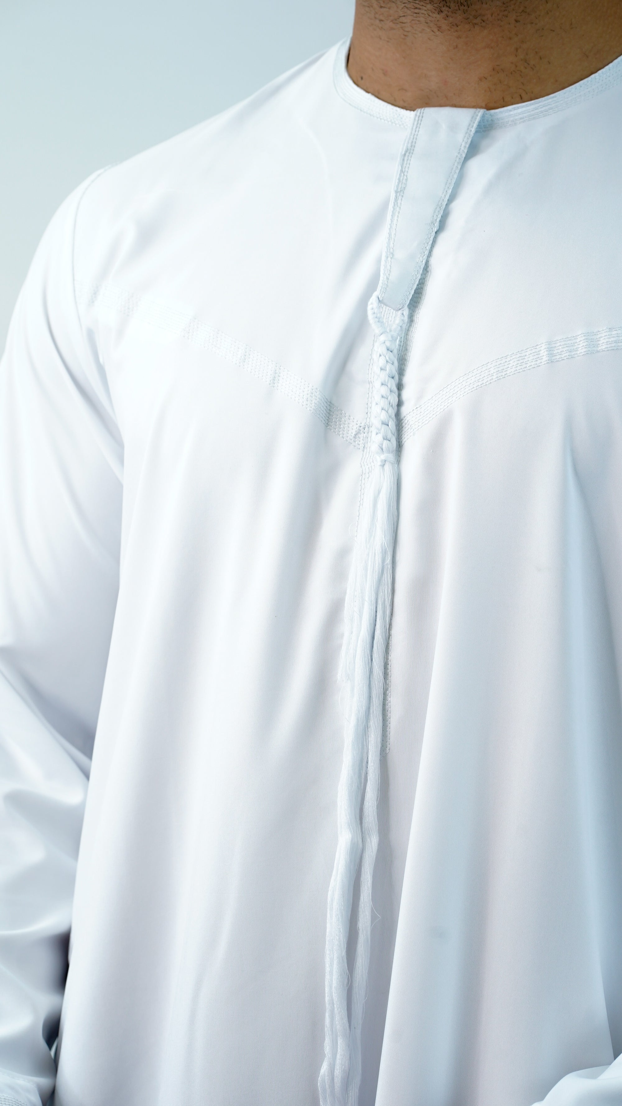 The Emirati Thobe in white is a classic, ankle-length garment made from lightweight fabric.