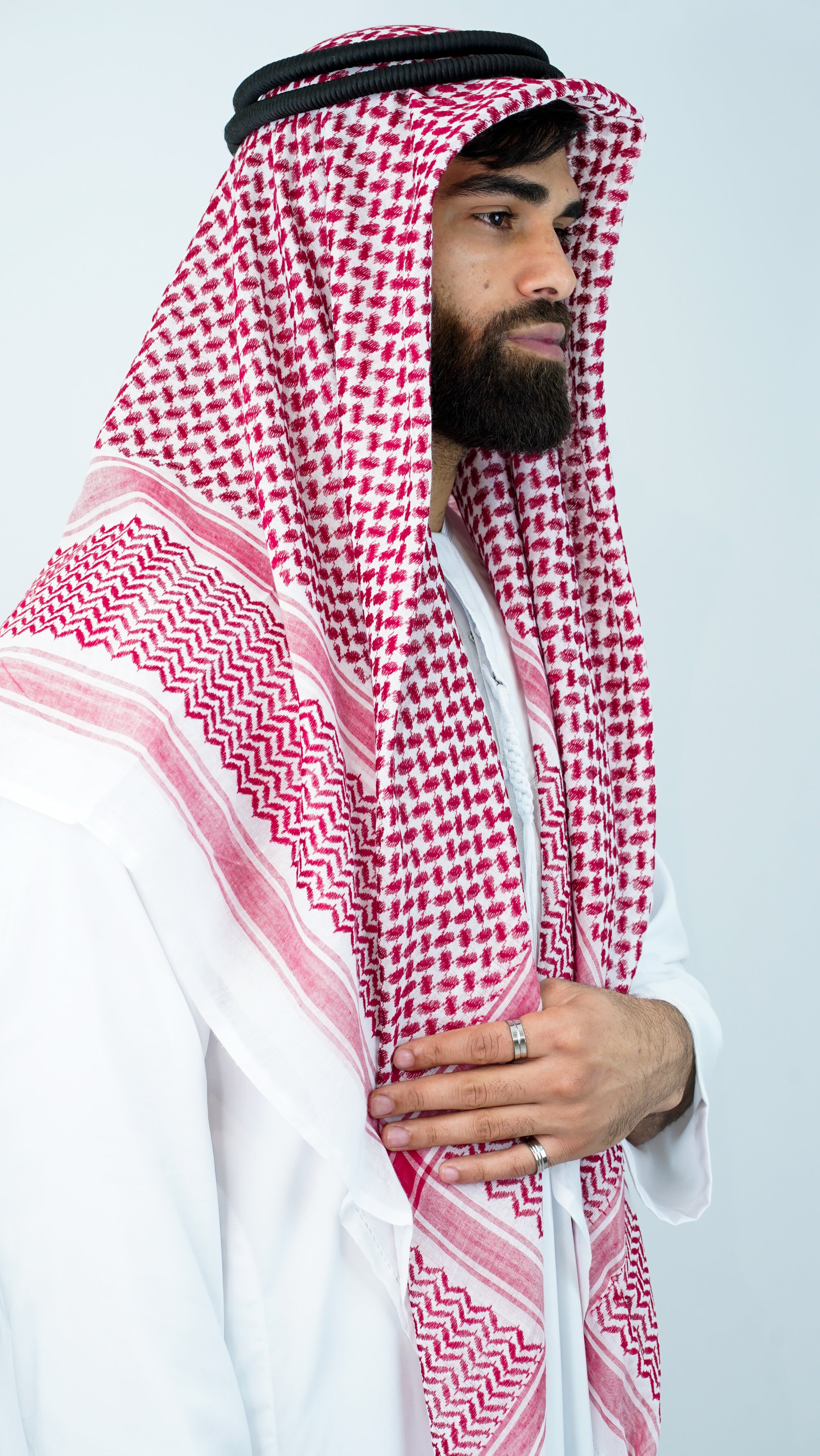 An Arabian scarf, known as a keffiyeh or ghutrah, is a versatile accessory made from lightweight cotton.