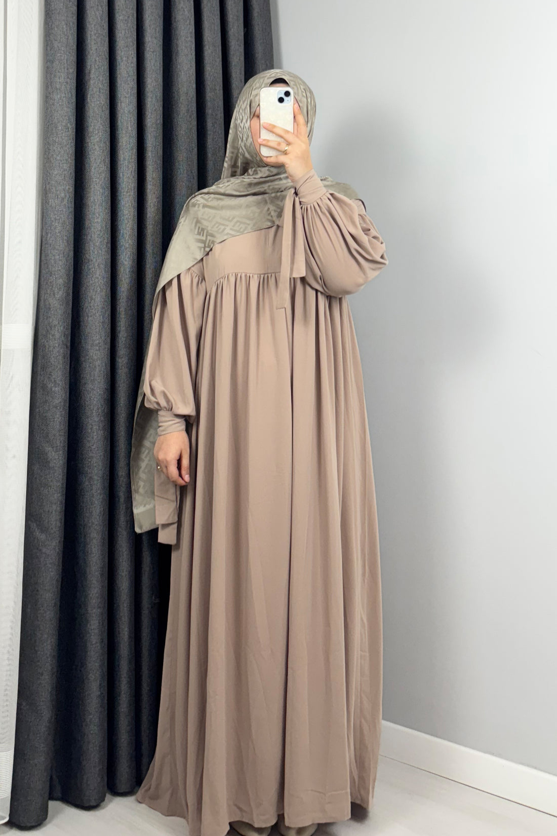 The Beige Umbrella Cut Closed Abaya is the epitome of effortless elegance and contemporary style.