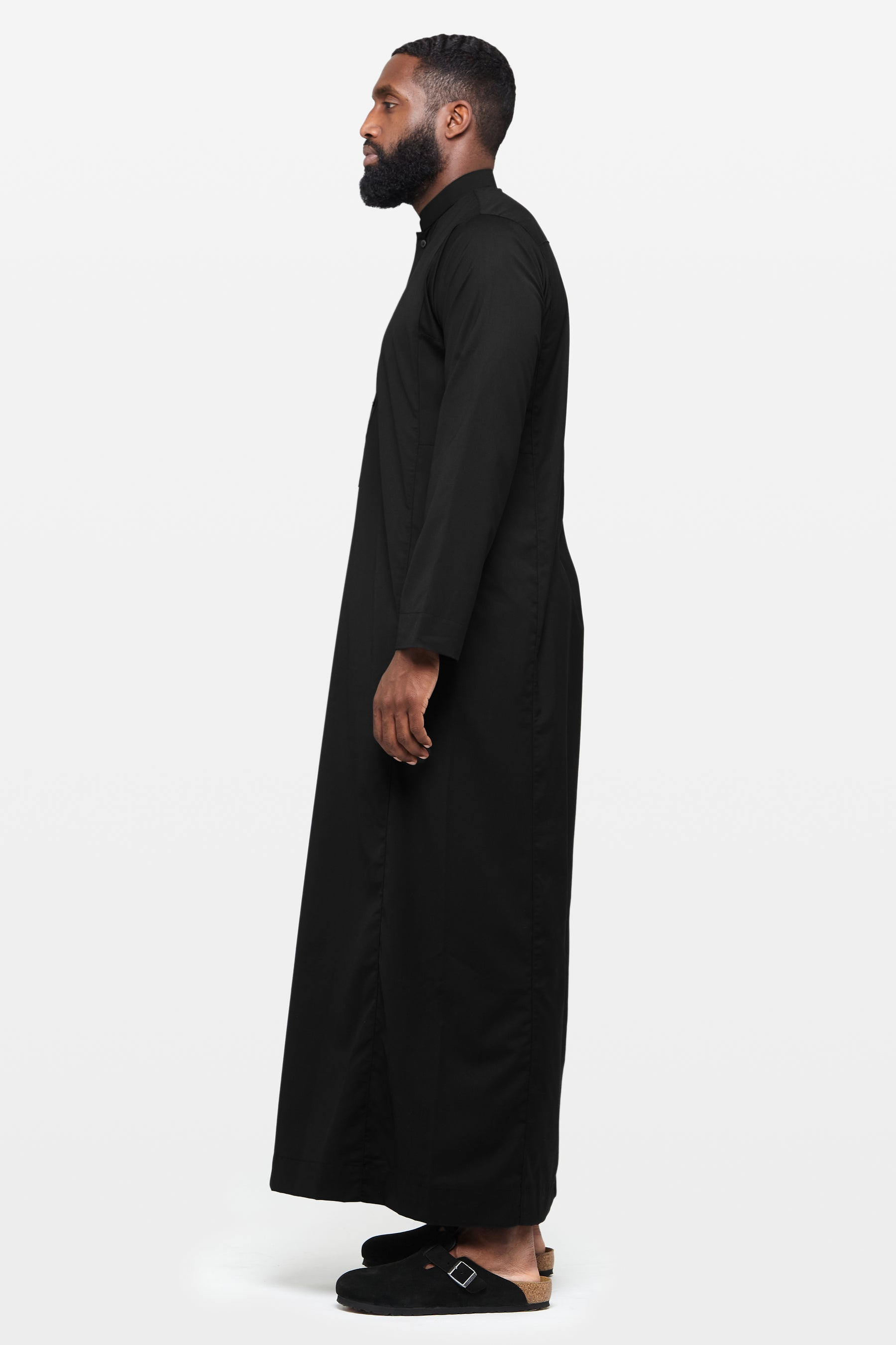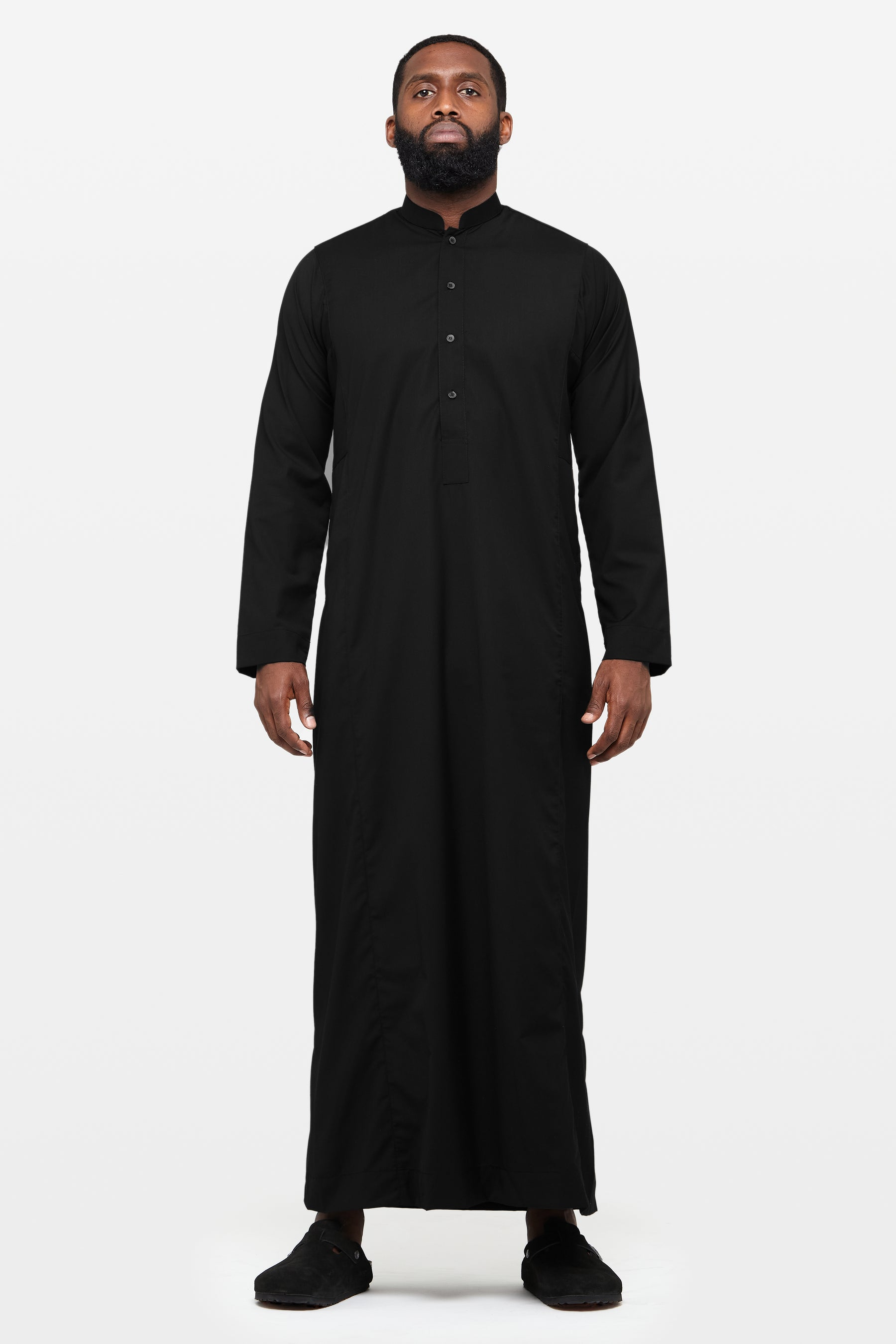 A classic Standard Black Thobe for daily wear, featuring a short collar, snap button placket, and functional pockets. Made from a comfortable and durable 76/24 Poly/Viscose blend.