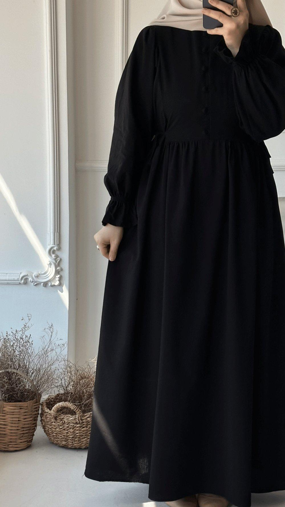 Adding to its elegance are the thoughtfully placed functional buttons that run down the front. These details not only create a timeless, streamlined look but also offer practical benefits, such as ease of wear and discreet access for nursing mothers. The dress’s loose, comfortable fit and modest cut ensure graceful movement and full coverage. Whether you’re attending a special event or simply seeking an elegant everyday look, this dress is the perfect choice for combining unique design with effortless comfort.