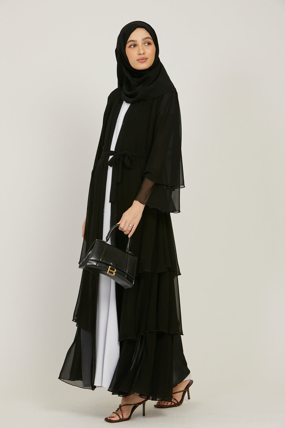 A stunning, versatile Chiffon Layered Open Abaya in black, featuring beautiful layered fabric for a dreamy silhouette, stud fasteners, and a complete set with a matching hijab and belt.