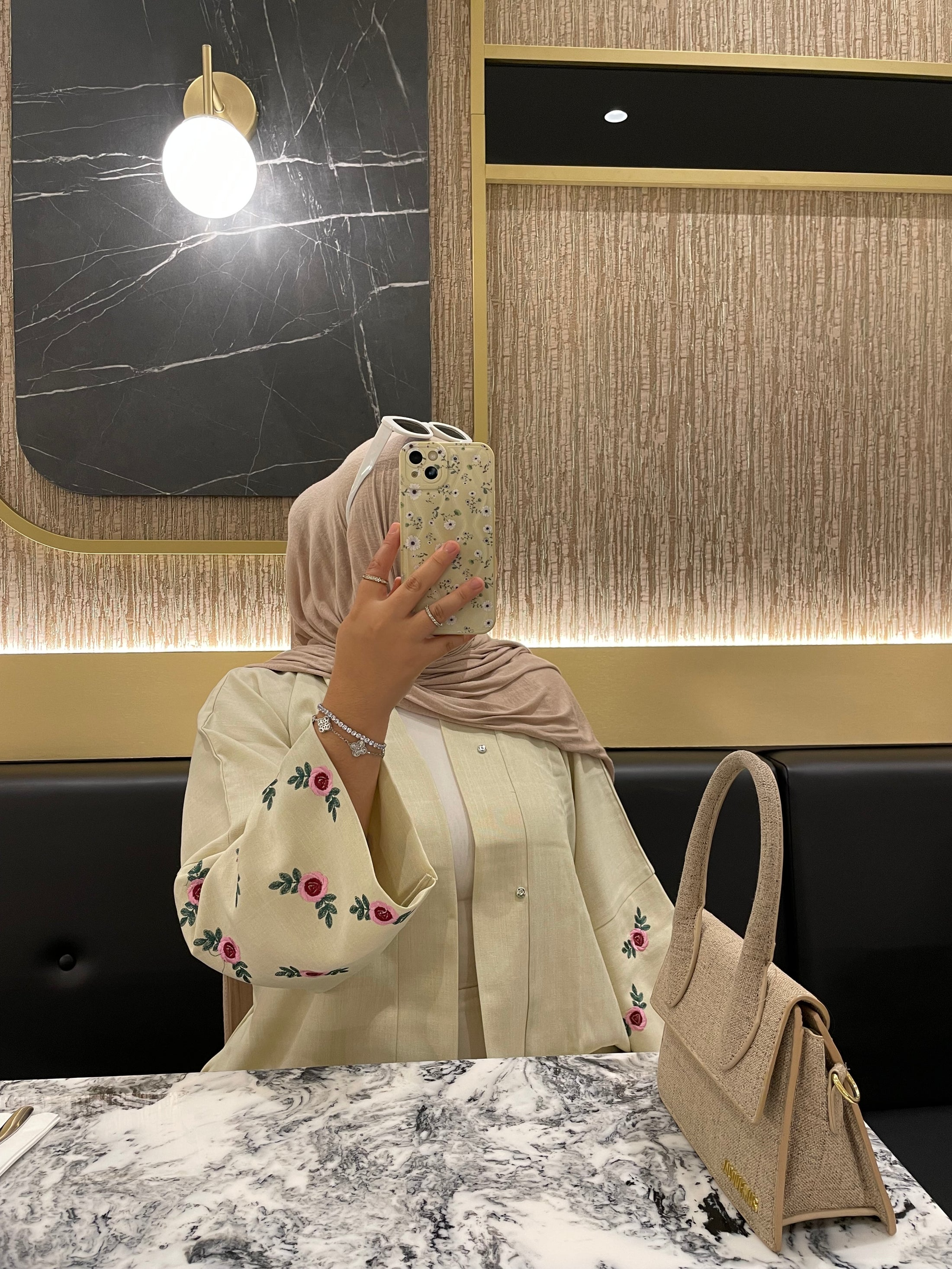 The Nuwar Abaya: Linen-Mix Elegance with Rose Embroidery