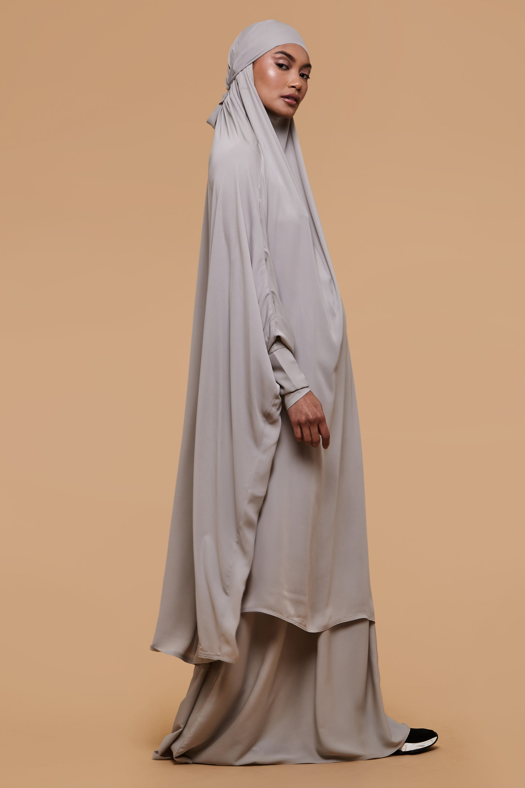 A two-piece jilbab in Rock Oak, crafted with AIRify fabric for breathability, featuring an adjustable skirt, tie-back headscarf, and zip-finished sleeves for all-day comfort.