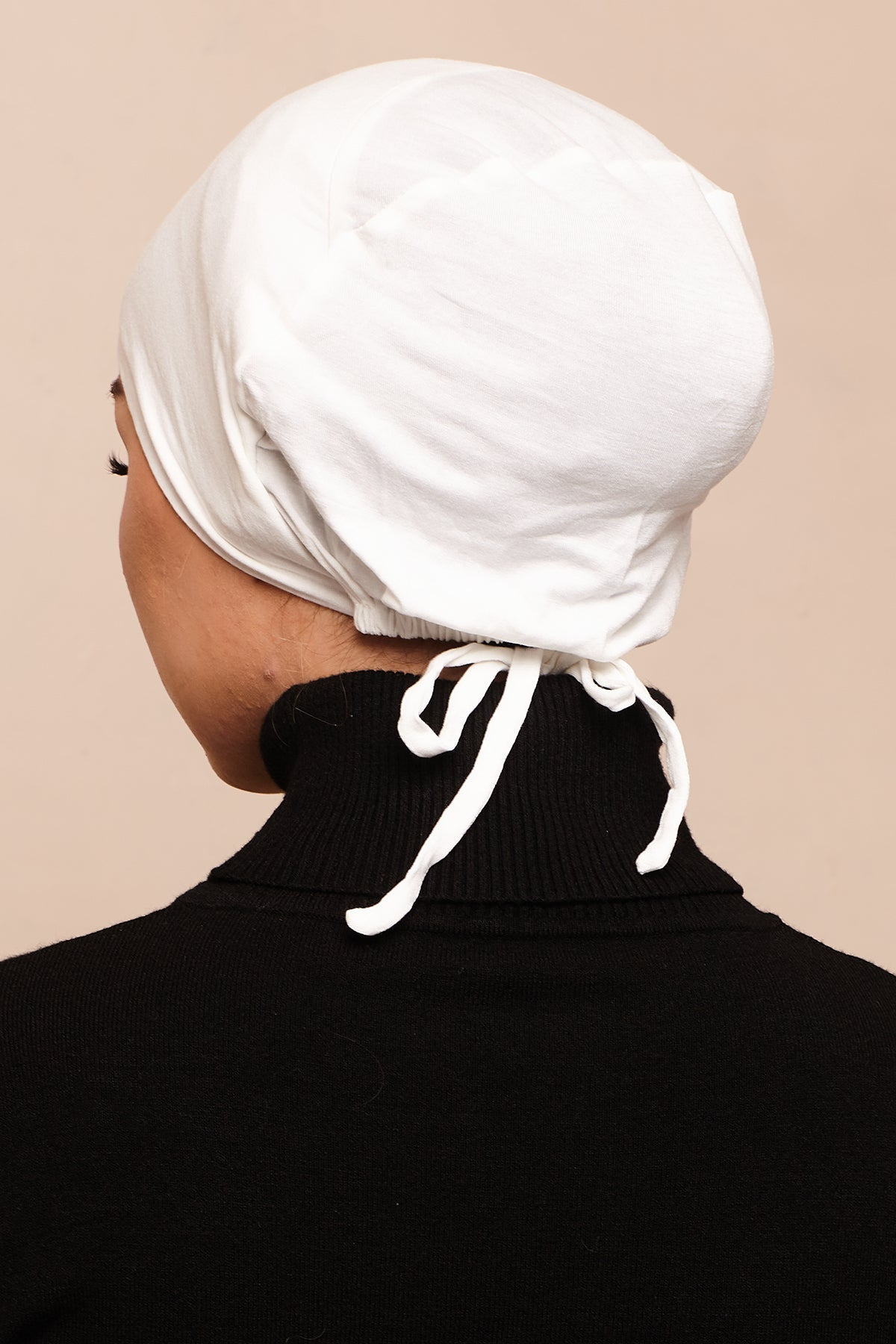 A pure white bamboo jersey hijab cap featuring an integrated scrunchie for added volume, a secure non-slip fit, and breathable all-day comfort.