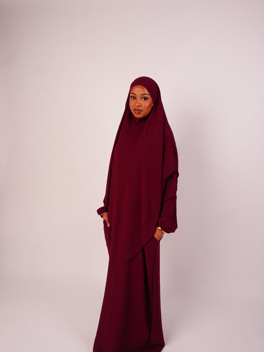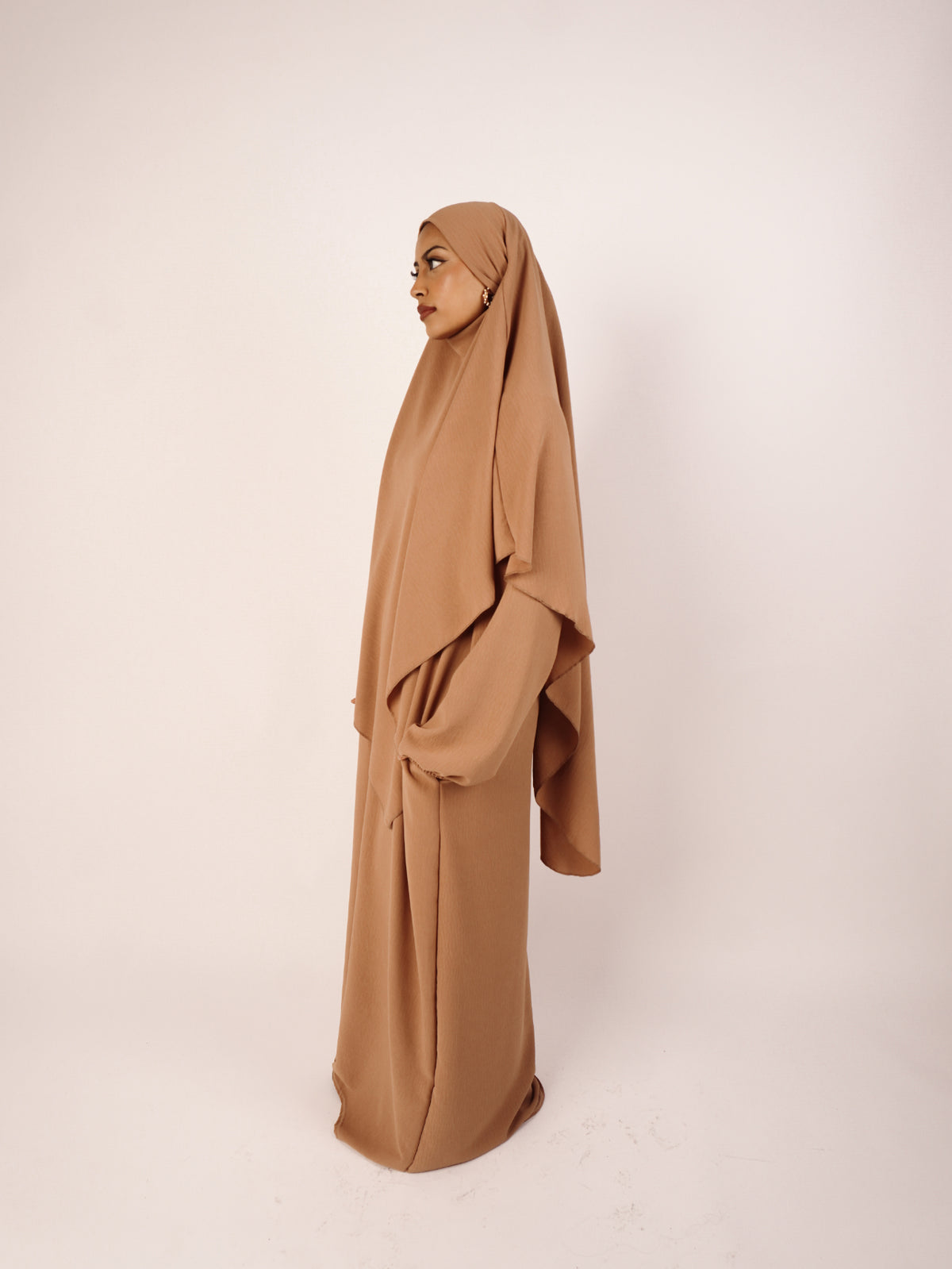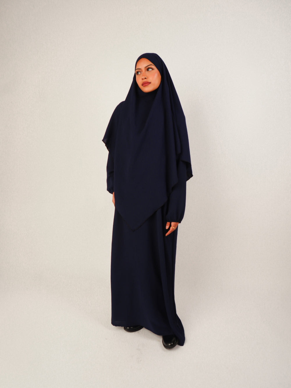 An effortless Two-Piece Khimar Set in soft viscose fabric, featuring an abaya with cuffed sleeves and a khimar with a niqab feature and tie-back strings for easy, elegant, all-day modesty.