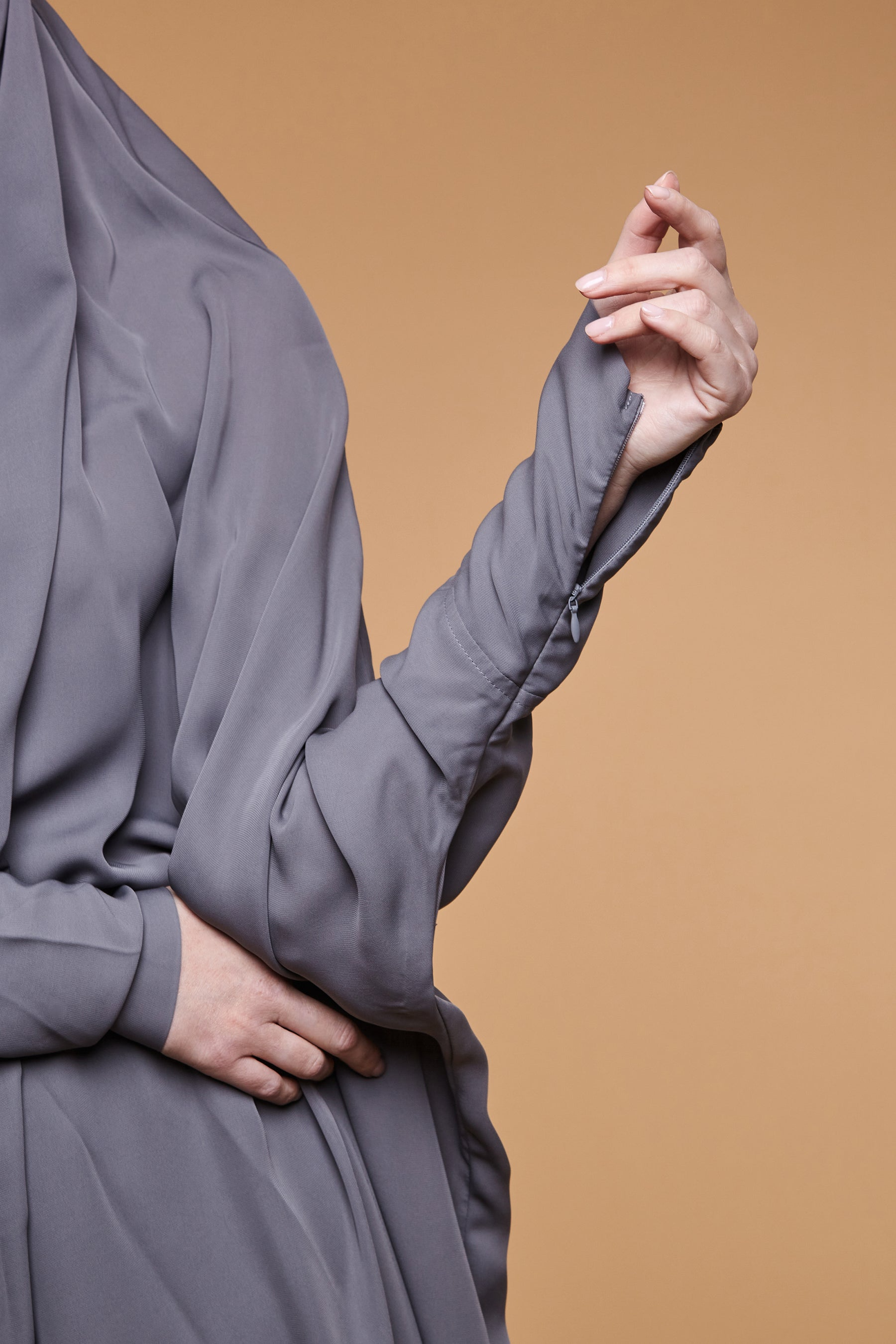 The elasticated skirt is designed for flexibility and can be easily folded at the waist to achieve your preferred length. For an added touch of refinement, the sleeves are finished with stylish zip closures, combining elegance with functionality. The deep Shadow Charcoal shade adds sophistication, making this jilbab a wardrobe essential.