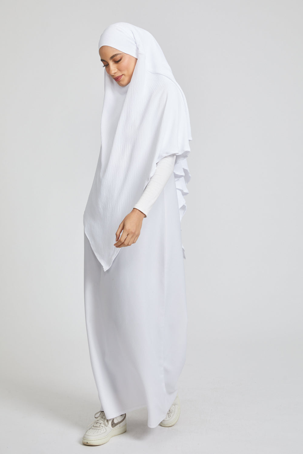 Embrace purity and grace with our White Two Layer Khimar, crafted from luxuriously soft crush fabric. Designed for lightweight comfort and full coverage, this khimar drapes effortlessly over your abayas, making it the perfect choice for prayer, daily wear, or special occasions.